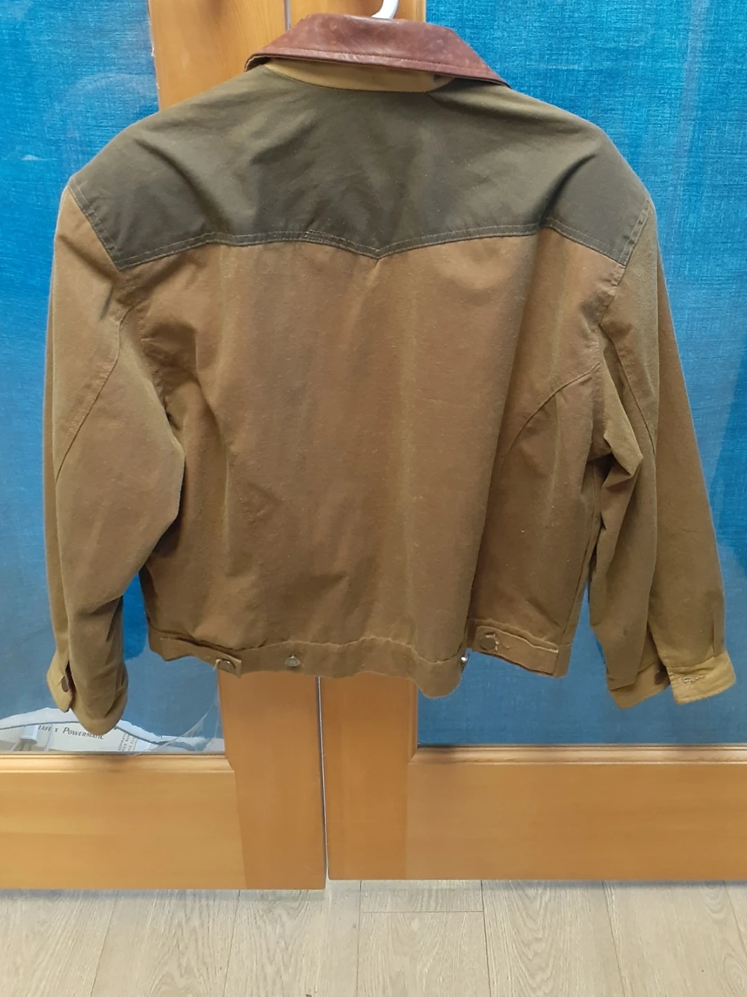 This Kakadu Traders jacket is made with 100% treated cotton outer and 100% cotton lining. It features leather trim on the collar and has two chest pockets. The jacket is size L and was made in Australia. Like new.