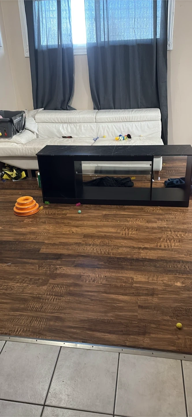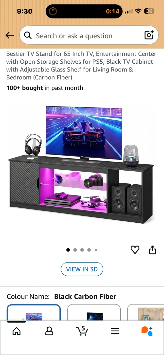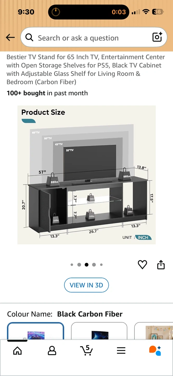 This Bestier entertainment center features open storage shelves and an adjustable glass shelf. It's made with a black carbon fiber finish. Dimensions are 57" W x 13.8" D x 20.7" H.