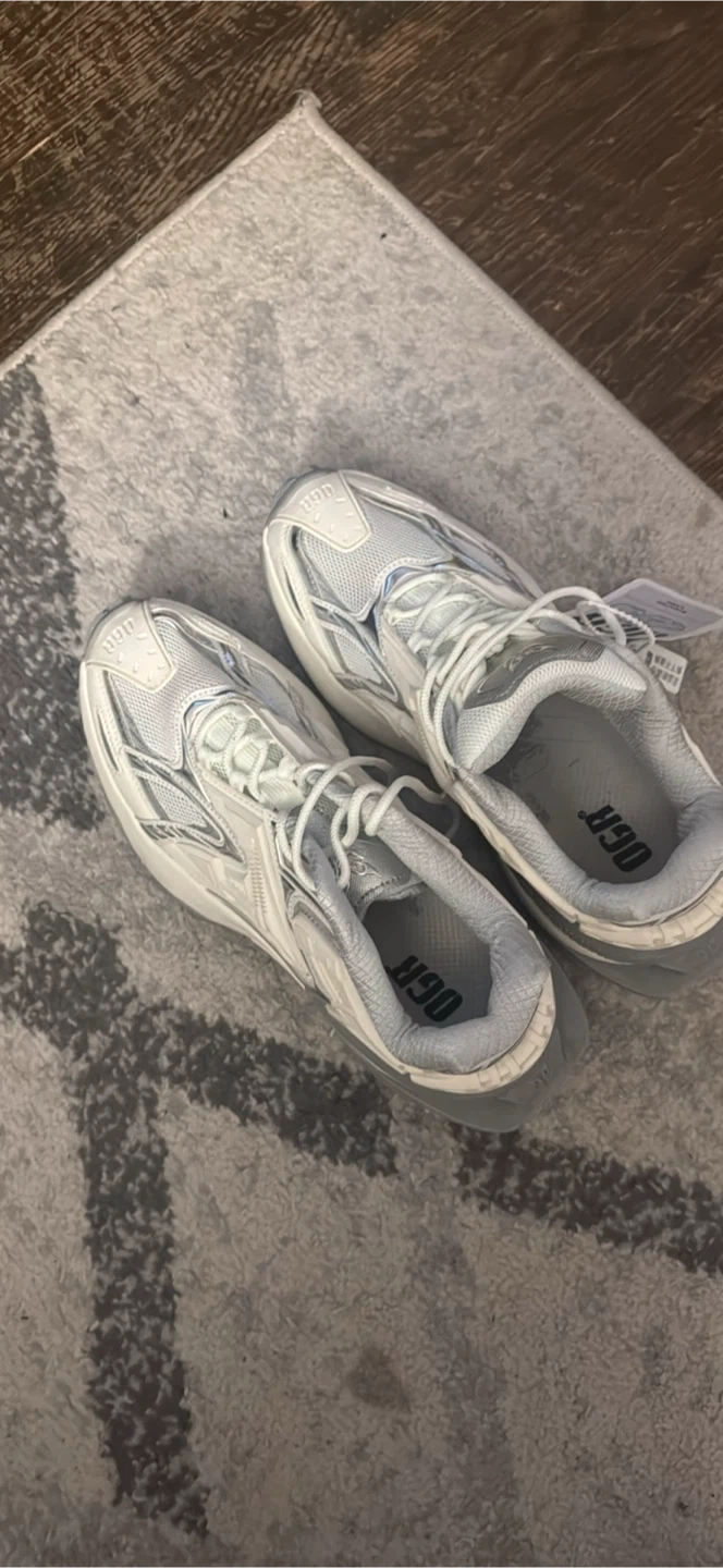 These OGR sneakers are white with silver accents. They feature a cushioned sole for comfort. This pair is suitable for everyday wear.