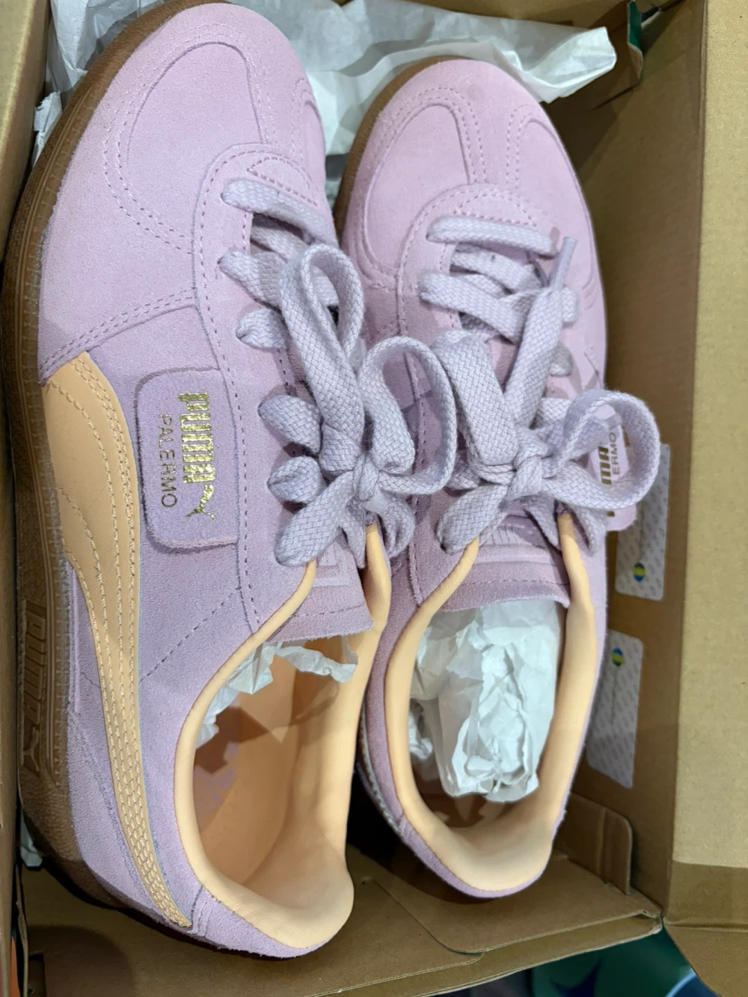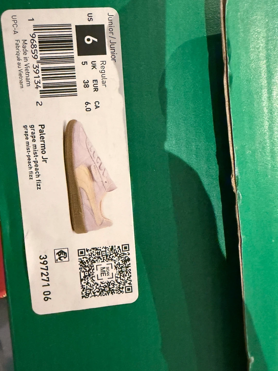 Puma Palermo Jr. sneakers in a lovely grape mist and peach fizz colourway. These youth shoes are a size 6. They're made with a suede and synthetic upper. Comes with original box.
