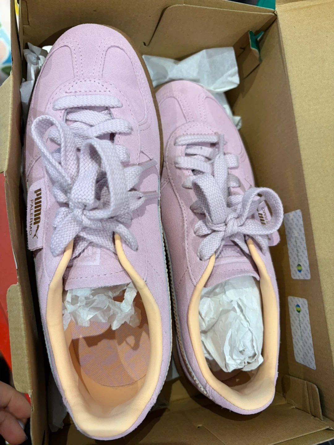 Puma Palermo Jr. sneakers in a lovely grape mist and peach fizz colourway. These youth shoes are a size 6. They're made with a suede and synthetic upper. Comes with original box.
