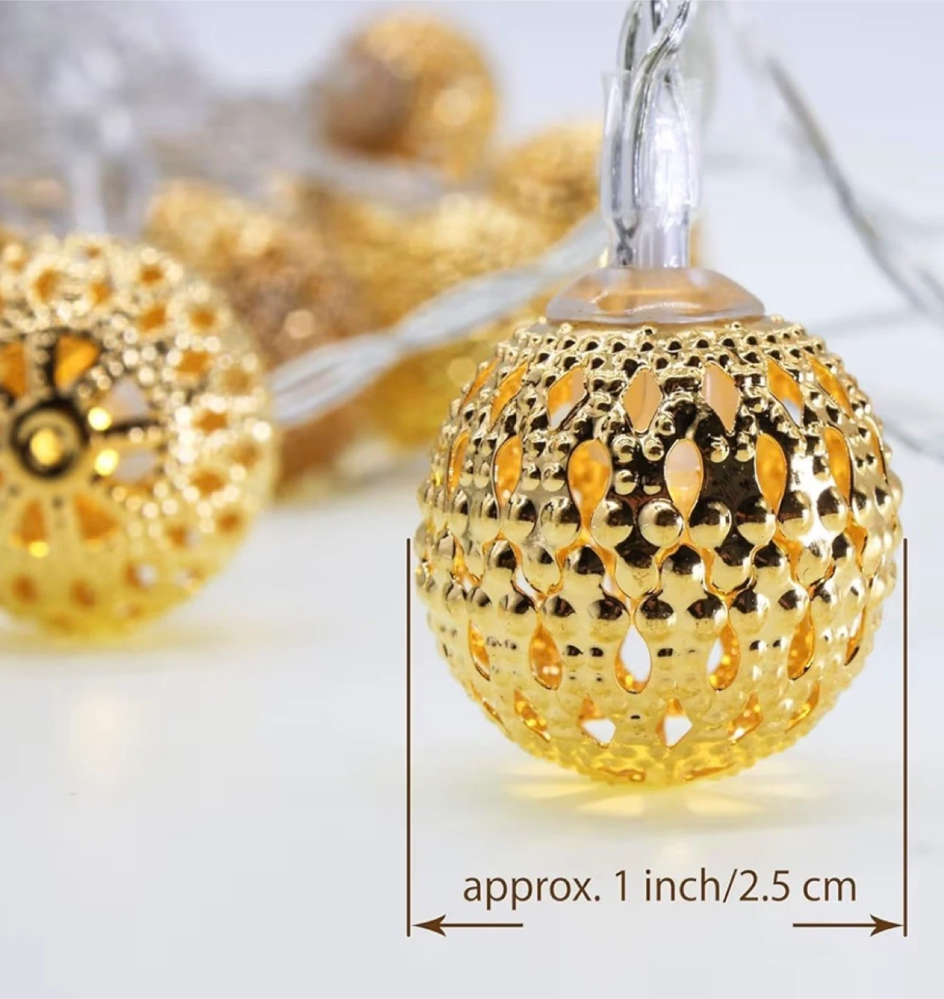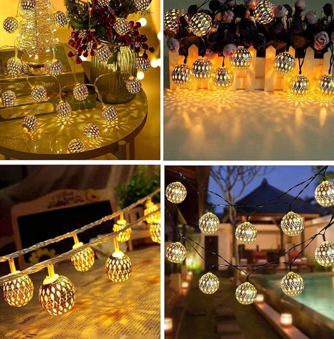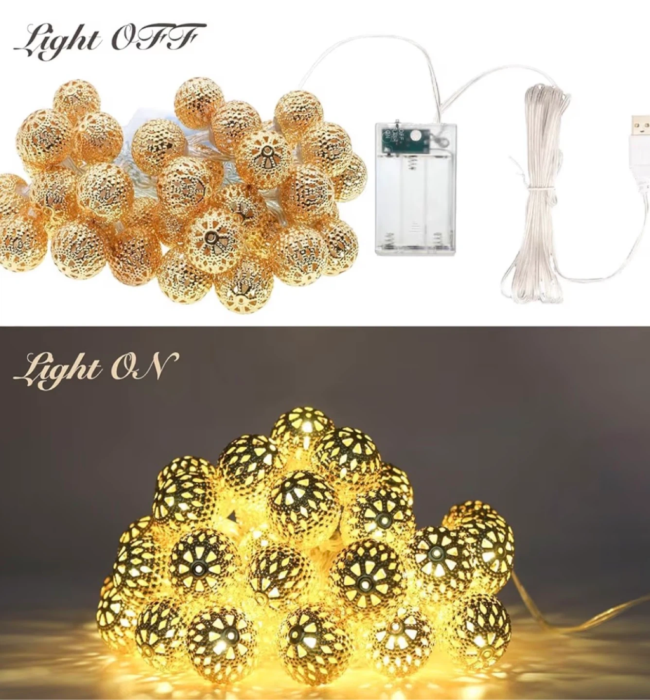 Beautiful Moroccan-style LED string lights with gold decorative lantern balls that create a warm, cozy glow. Perfect for bedrooms, balconies, patios, events, or festive decor. Connects through a USB.