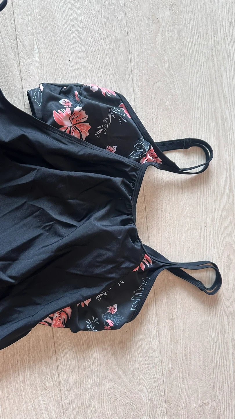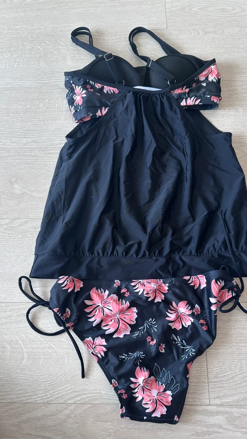 Two-piece black tankini swimsuit with a floral print on the bottoms and accent details. Features adjustable straps for a comfortable fit. This swimsuit is great for swimming or lounging!