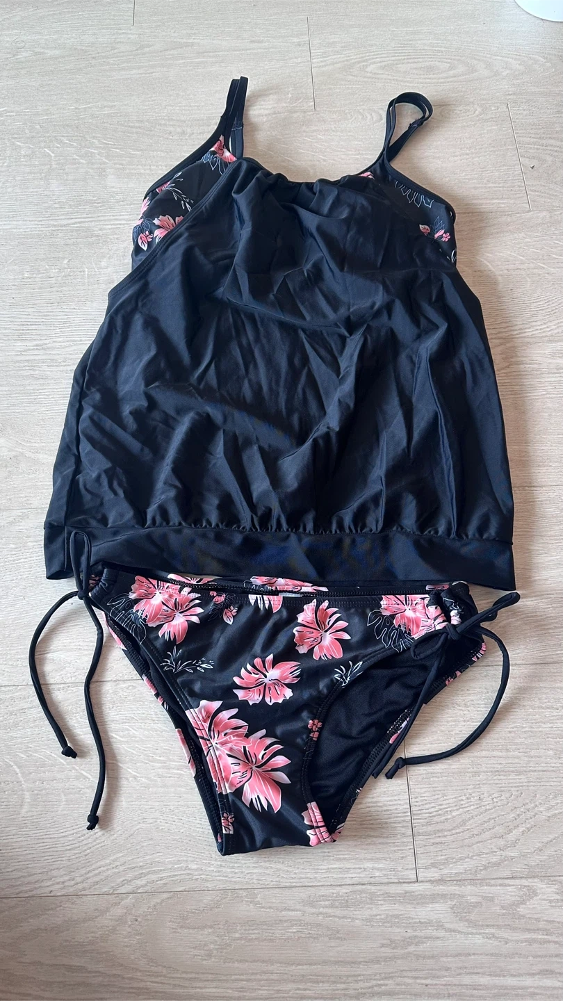 Two-piece black tankini swimsuit with a floral print on the bottoms and accent details. Features adjustable straps for a comfortable fit. This swimsuit is great for swimming or lounging!