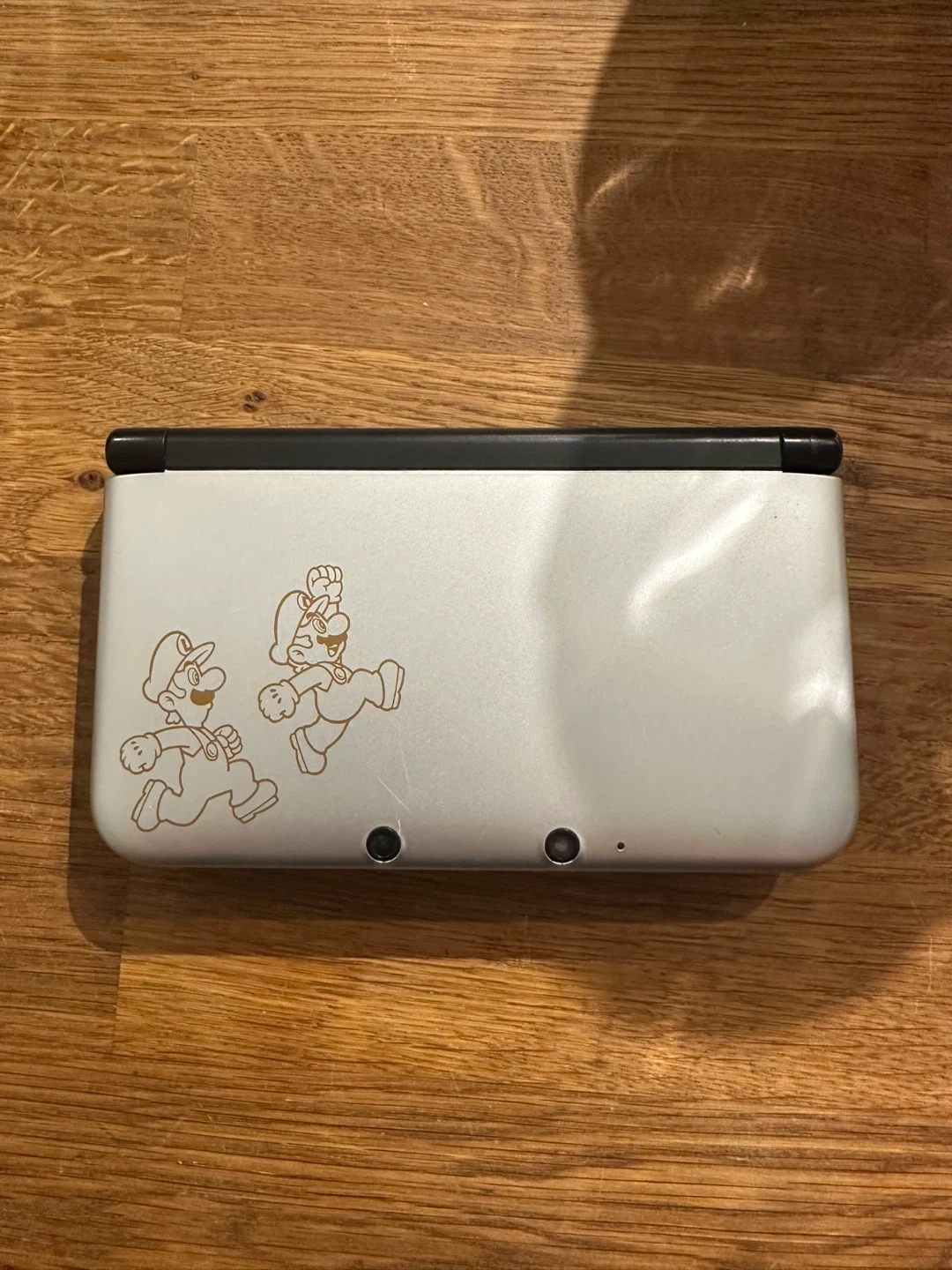 Nintendo 3DS XL console in silver with Luigi 30th anniversary design. It's in good condition and comes with a charger and a 4GB SD card.