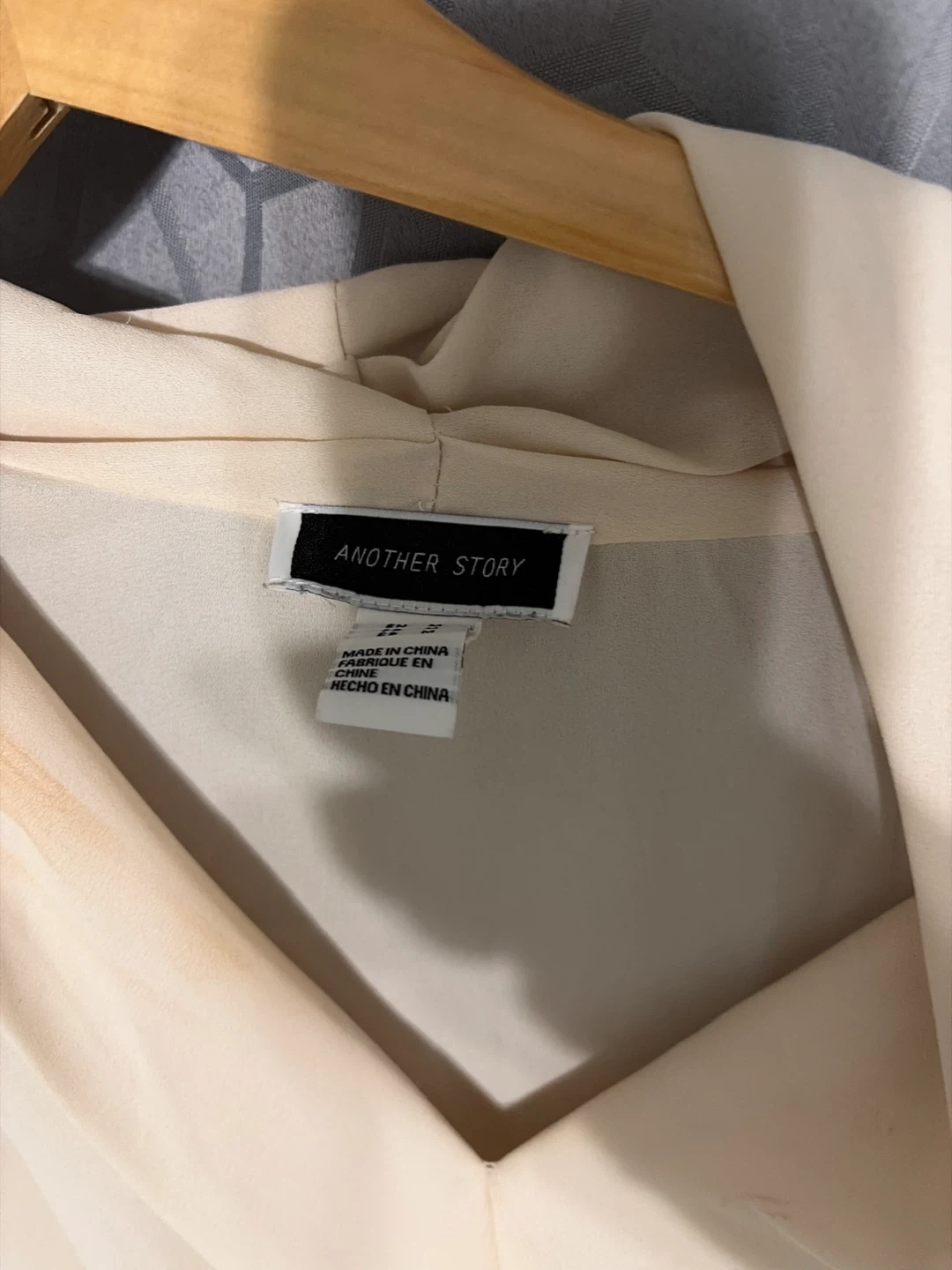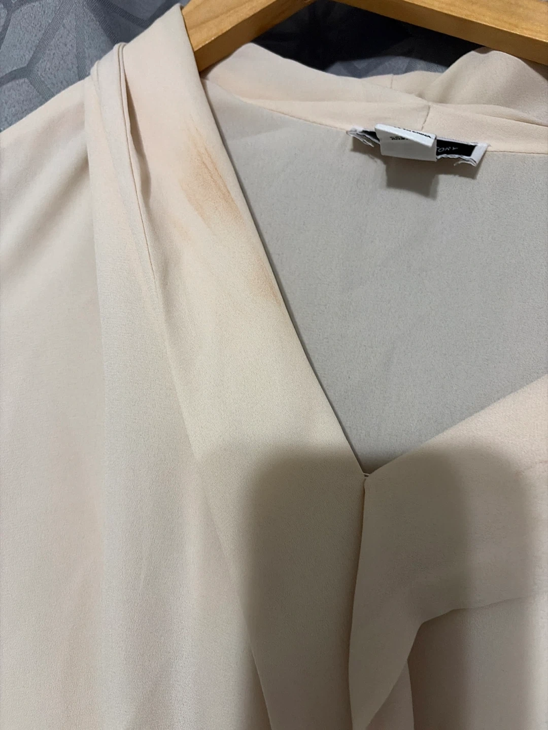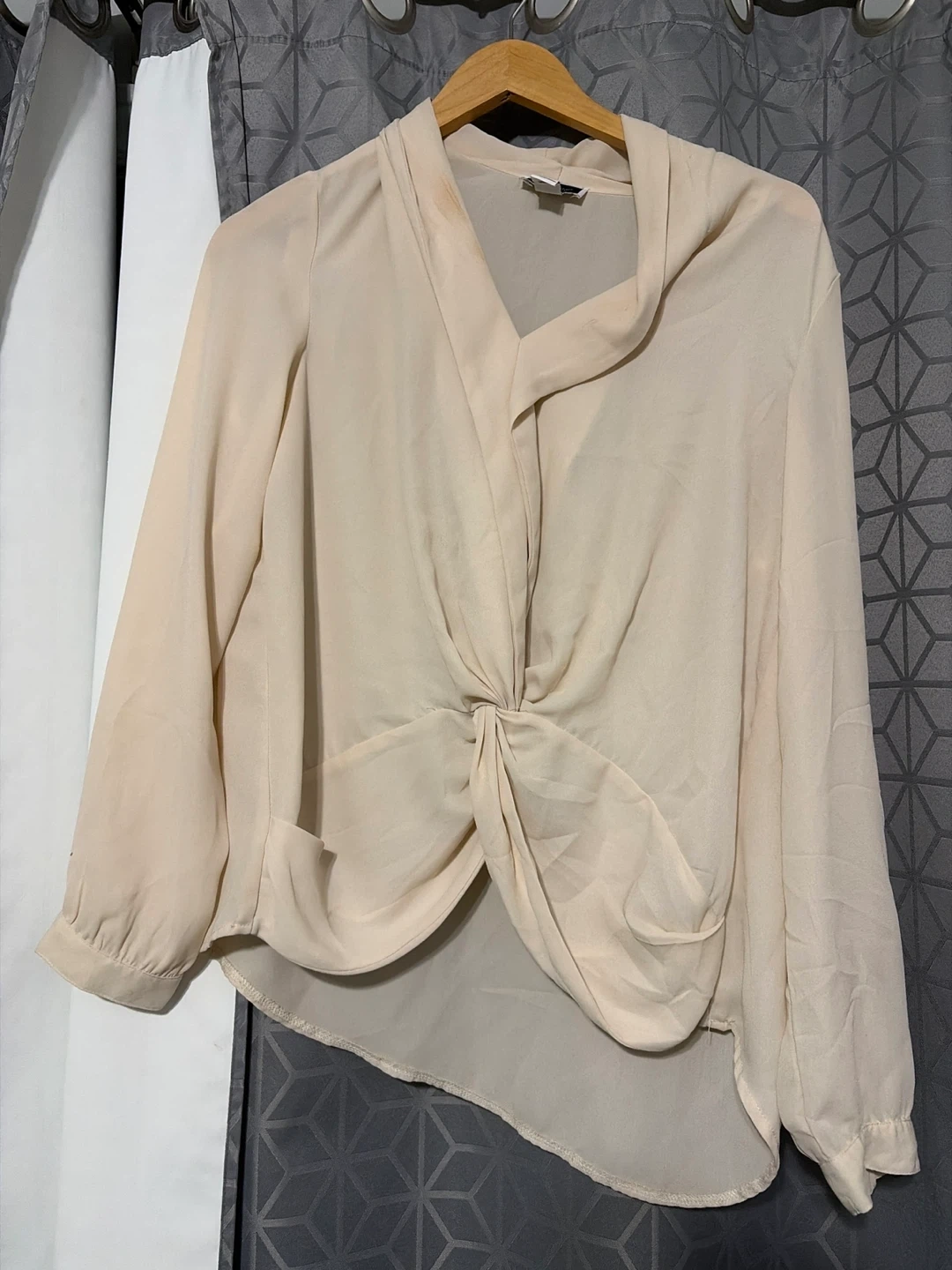 Lightweight cream-coloured blouse with a stylish twist front detail. It features long sleeves and a V-neckline. Some makeup mark on the collar