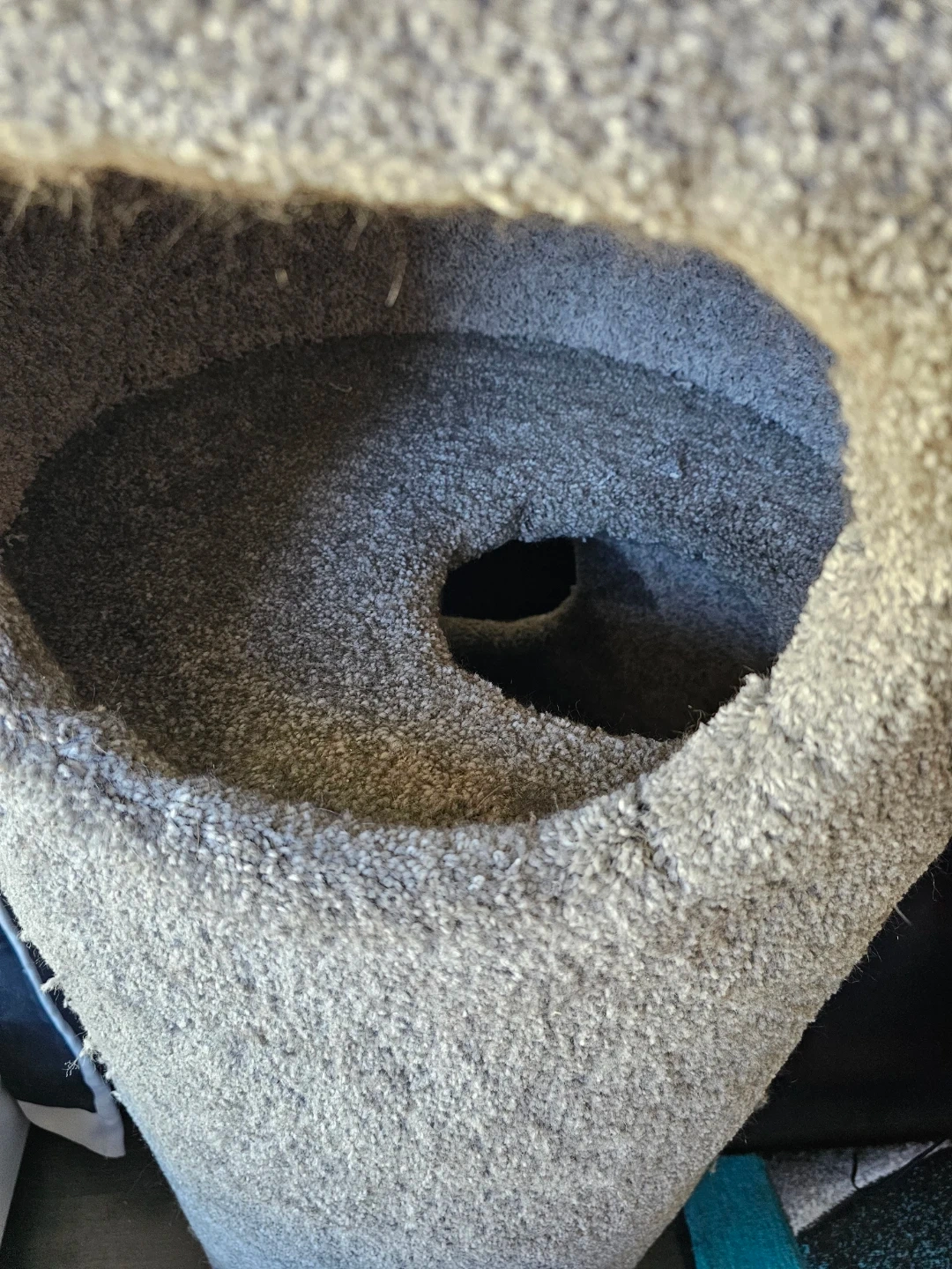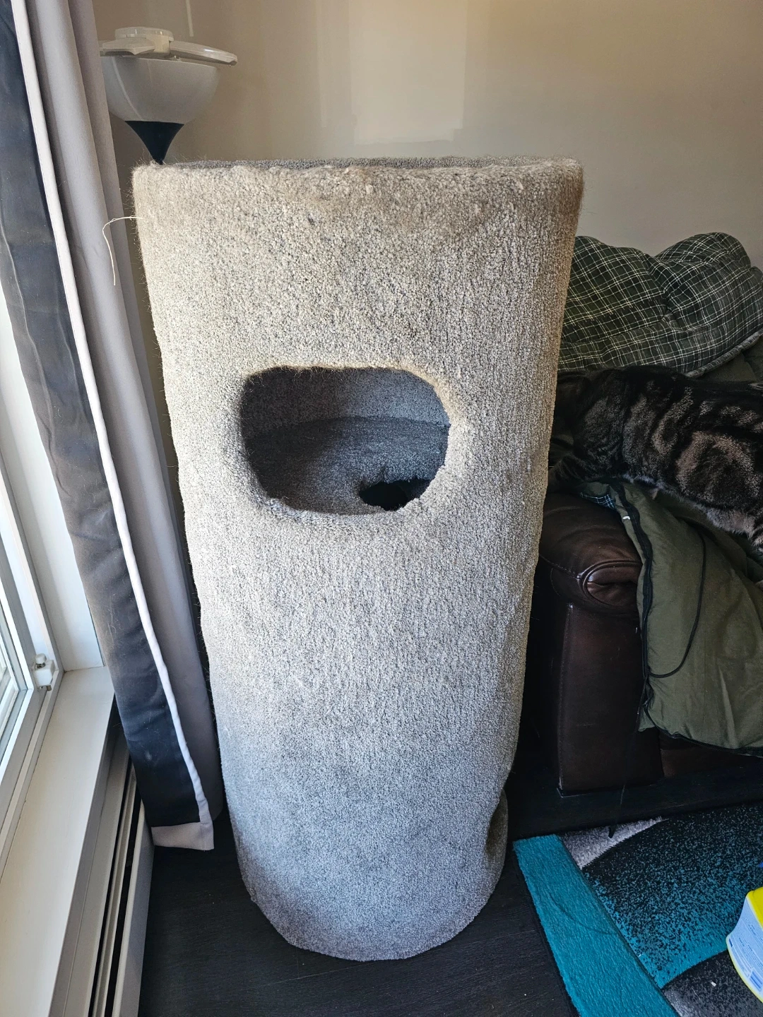 This is a carpeted cat condo with multiple openings for your feline friend to explore. It's made of durable carpet material, providing a scratching surface. Cats often enjoy hiding and resting inside such structures.