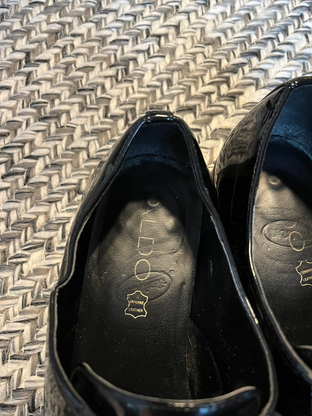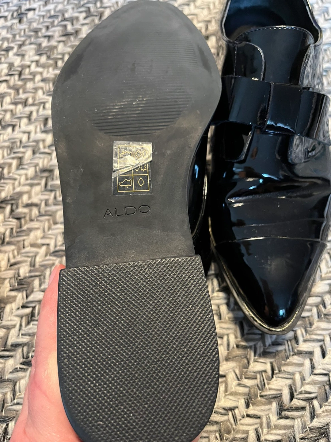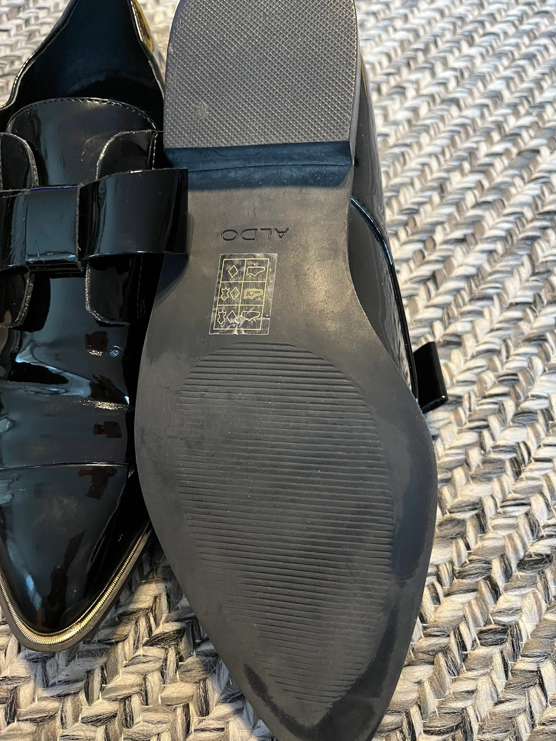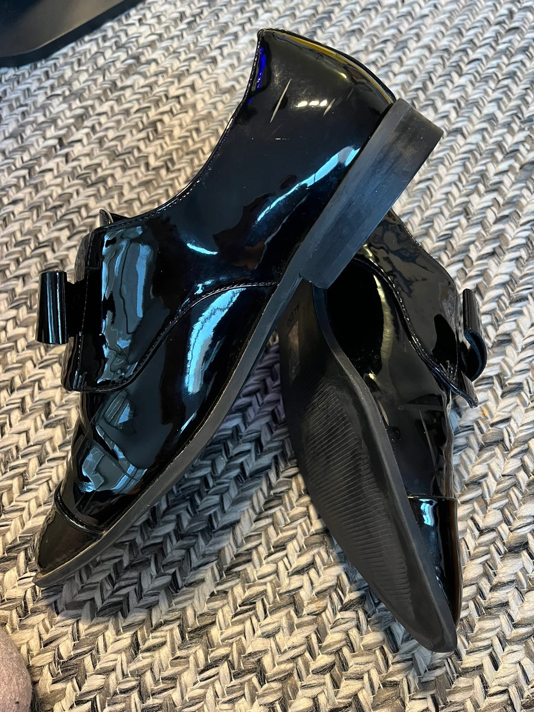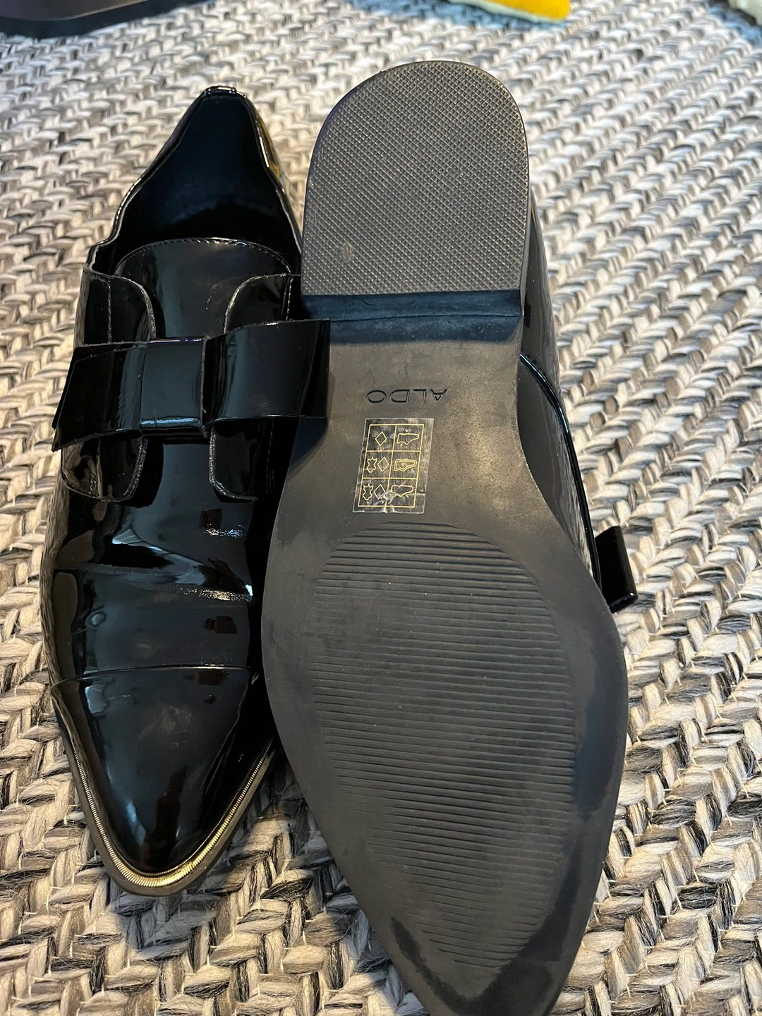 Aldo black patent leather slip on pointed flats. Worn a few times but good condition.