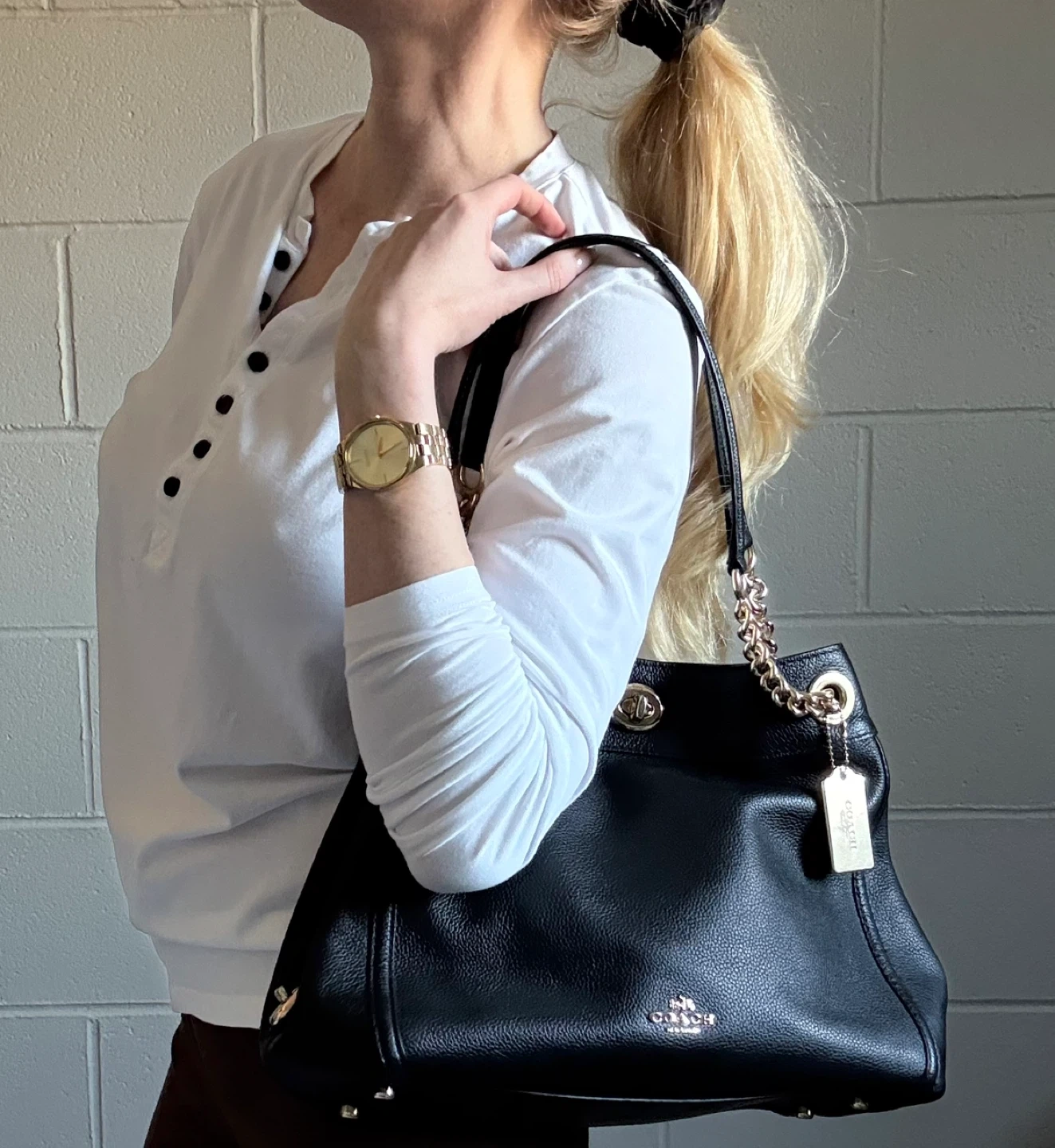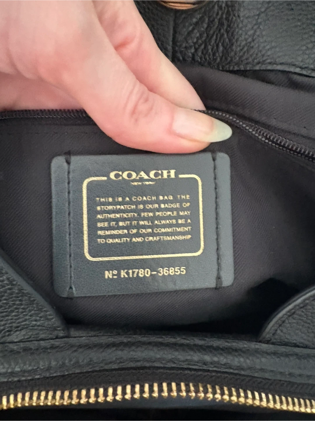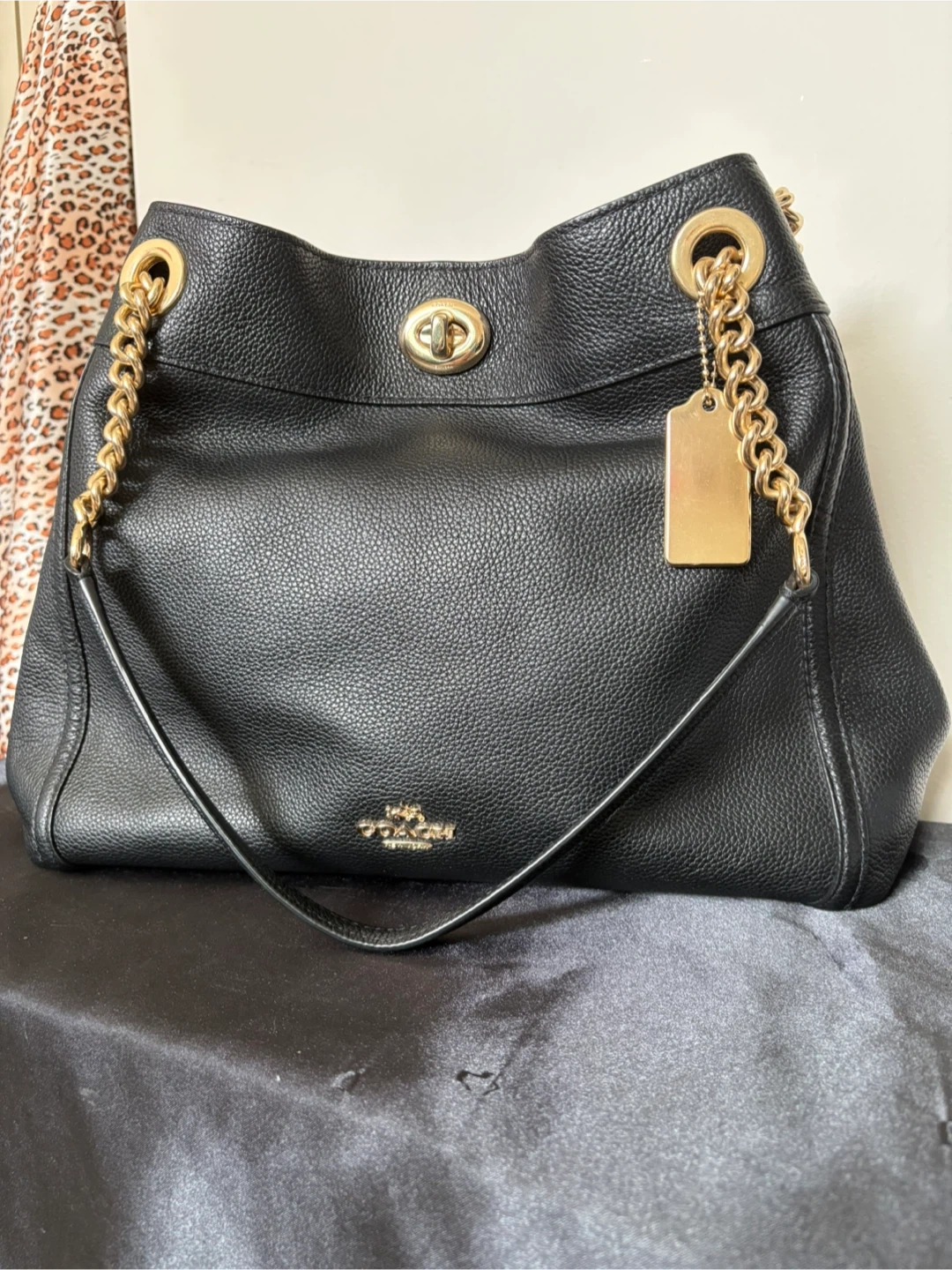 Selling a gently used Coach shoulder bag in black leather. It has a gold chain detail and the style number is K1780-36855. It's in great condition and perfect for everyday use!