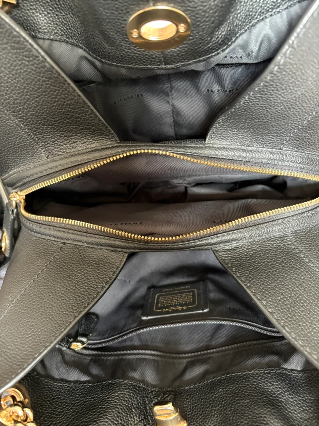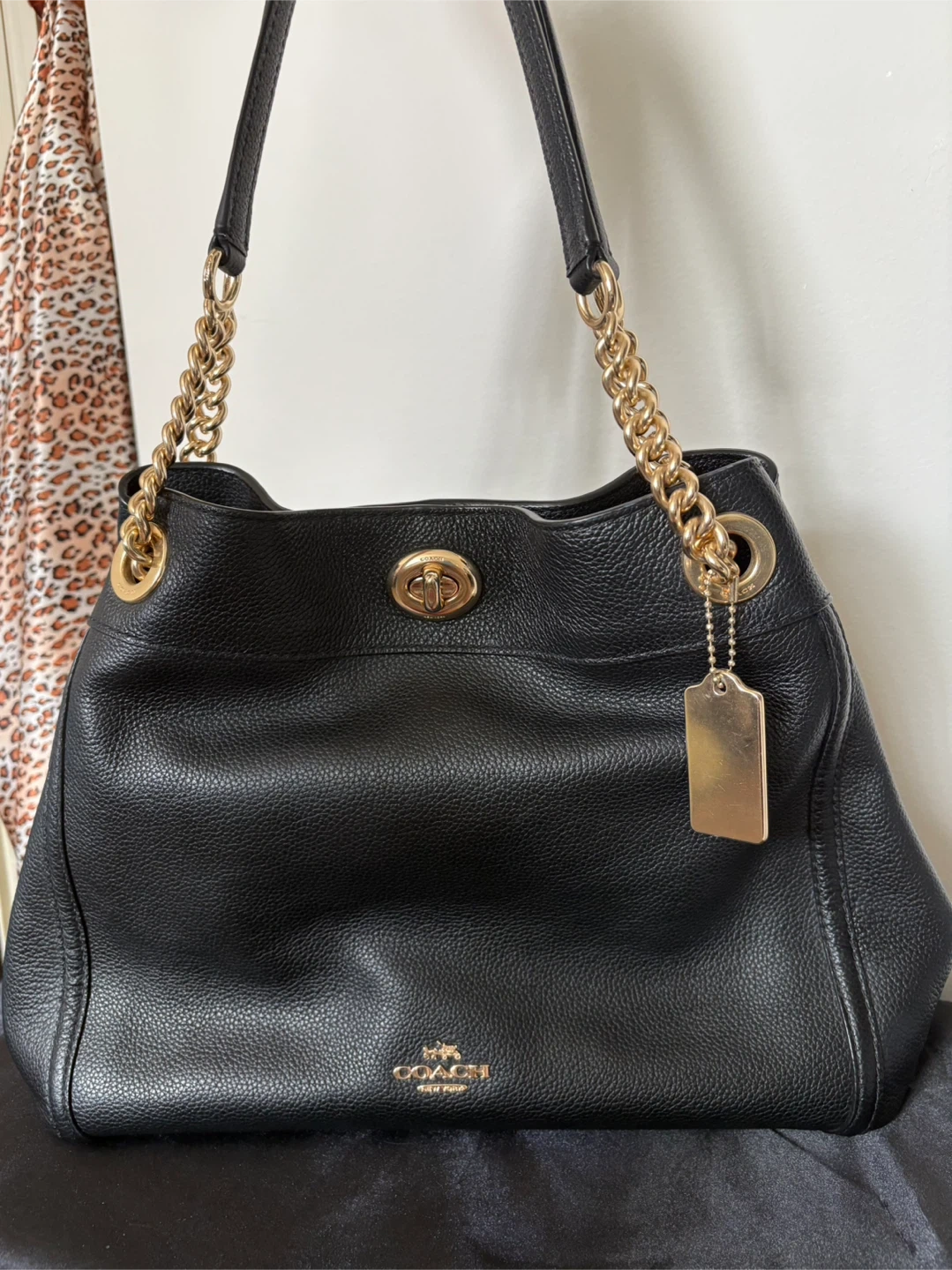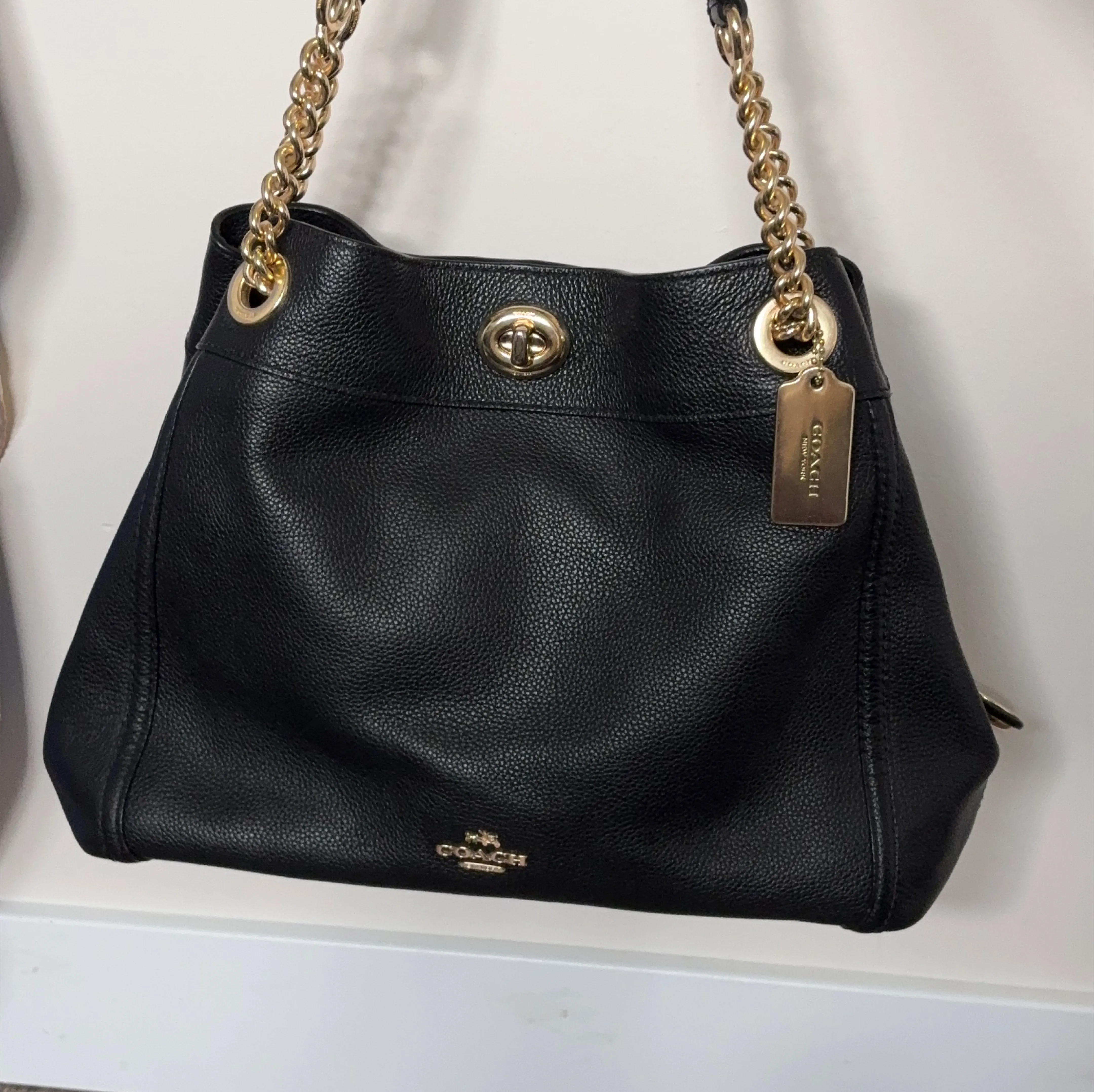 Selling a gently used Coach shoulder bag in black leather. It has a gold chain detail and the style number is K1780-36855. It's in great condition and perfect for everyday use!