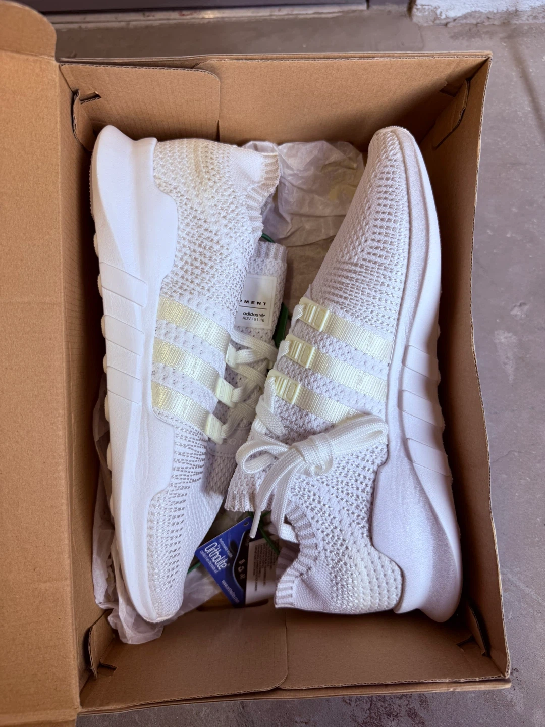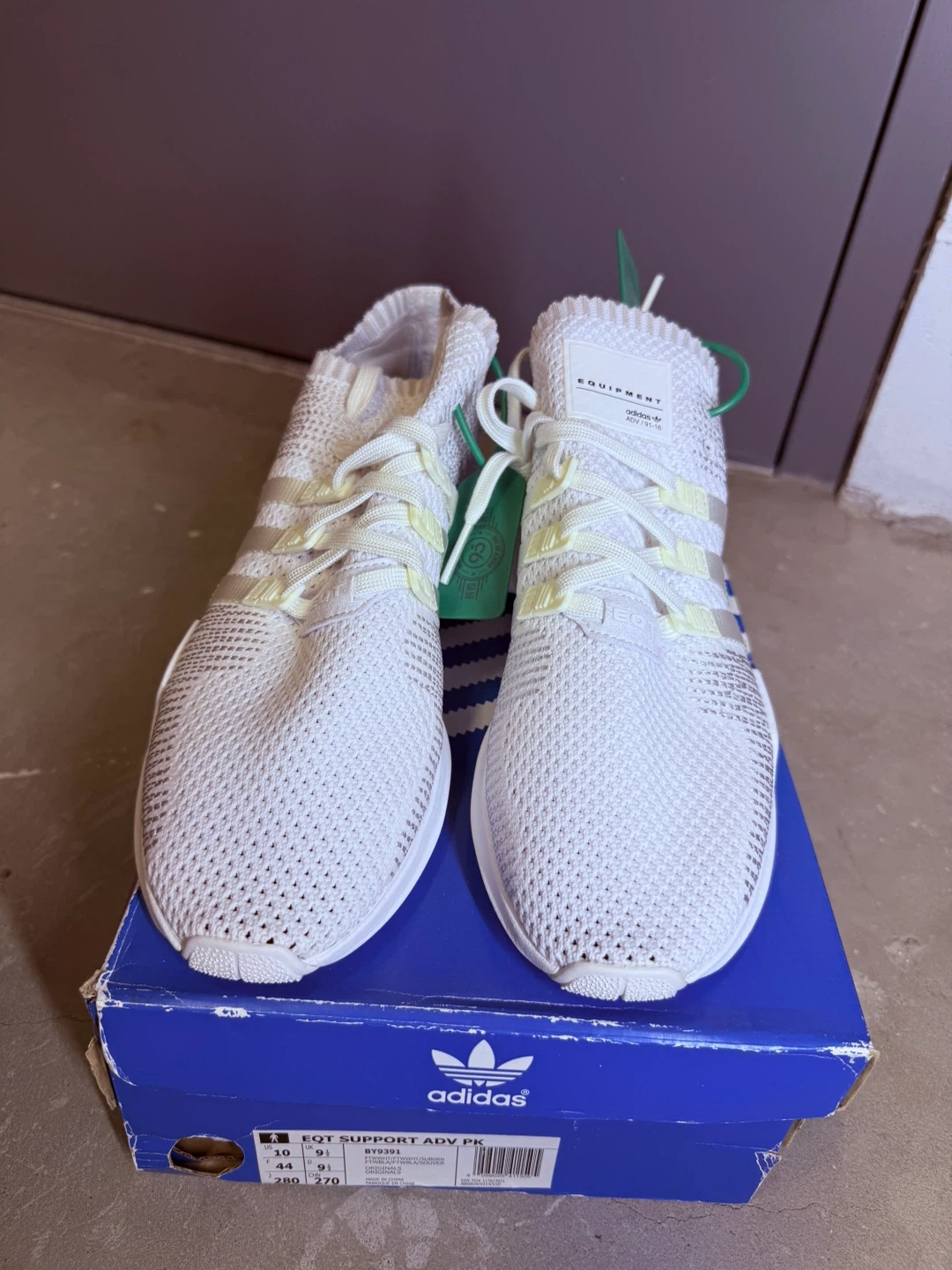 Adidas EQT Support ADV PK sneakers in white, size 10. These shoes feature a knit upper and rubber sole. Original box included. NEW, roomy.