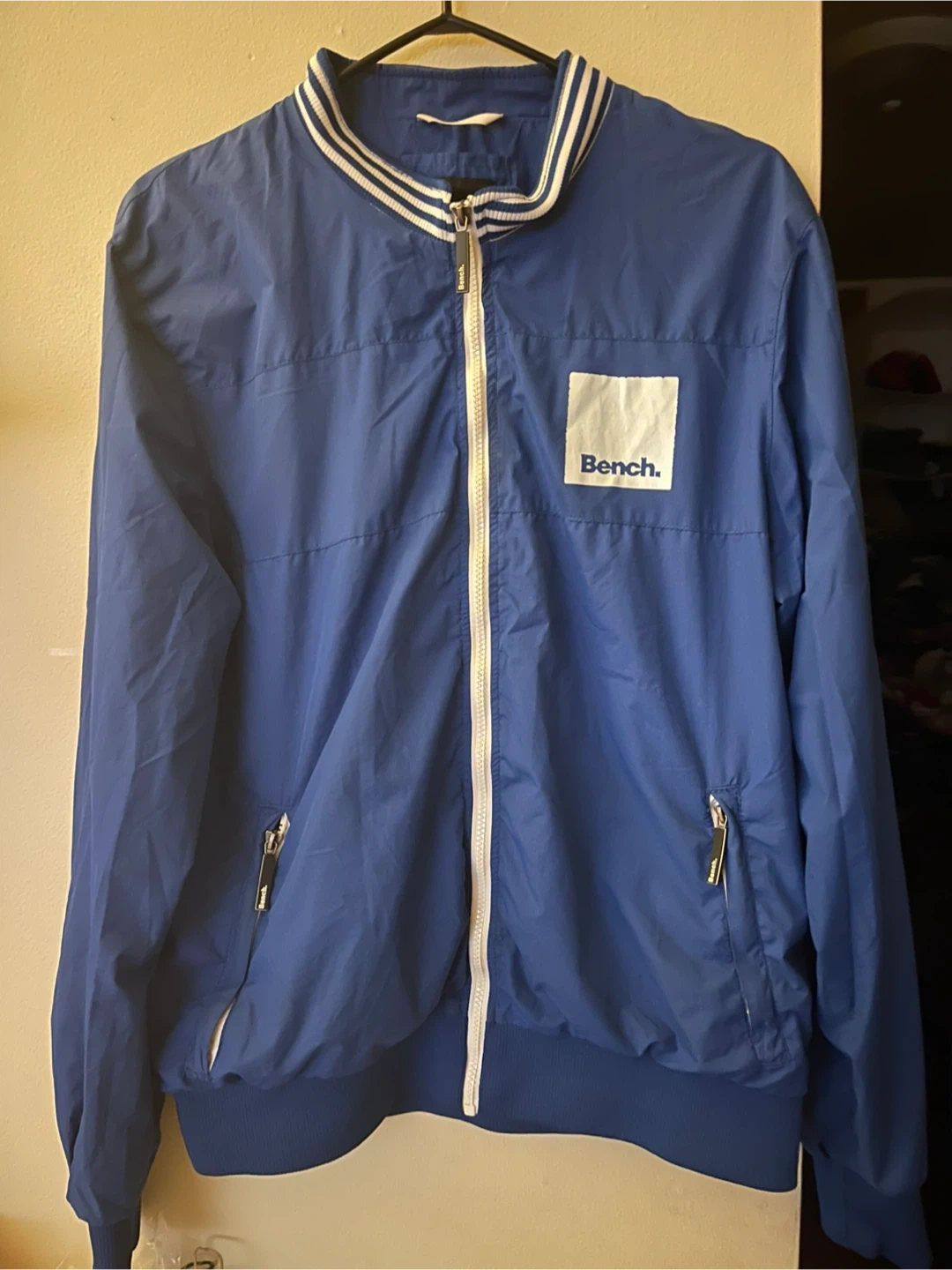 Bench track jacket in a vibrant blue colour. It's a size large and features a full zip front. This jacket is perfect for casual wear or light athletic activities.