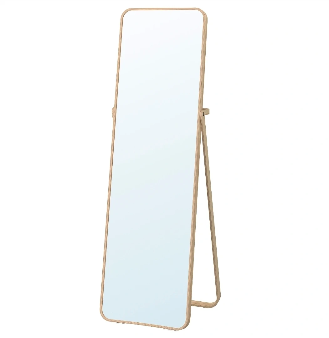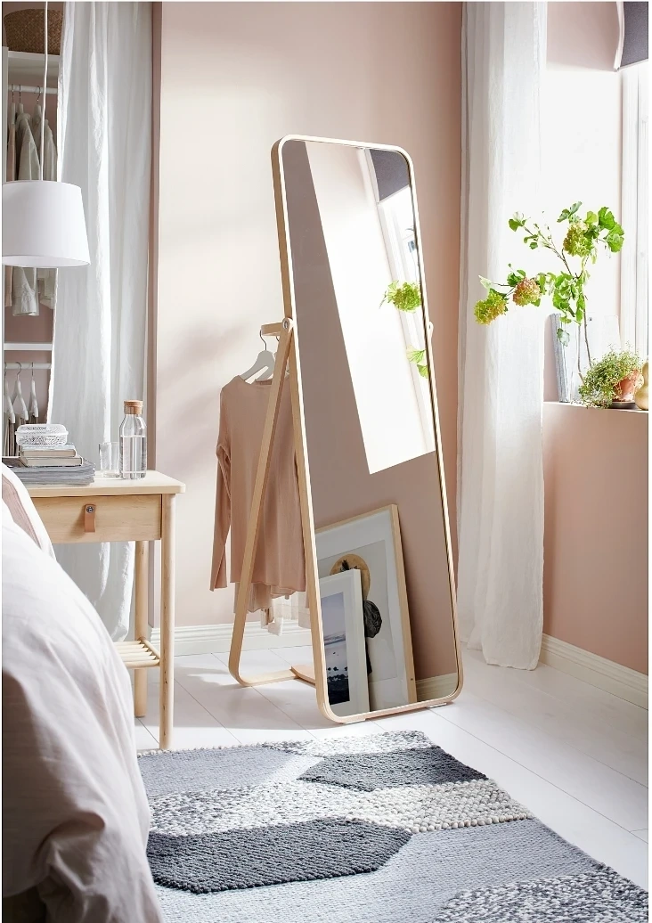 This is a freestanding mirror with a wooden frame and a built-in stand. It features a convenient bar with hooks for hanging clothes or accessories. It's perfect for a bedroom or entryway! Mirror still in packaging, brand new IKEA item.