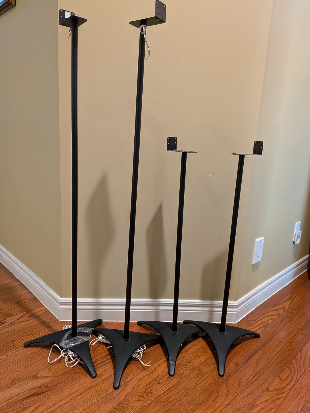 Selling a set of four speaker stands. They are black and are in good condition. Perfect for setting up your home theatre or sound system