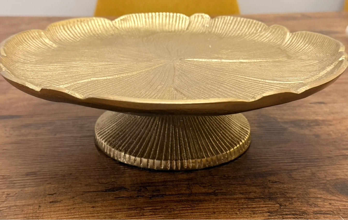 A decorative cake stand with a gold leaf design. It's made of metal with a fluted base. Perfect for displaying desserts or serving snacks!