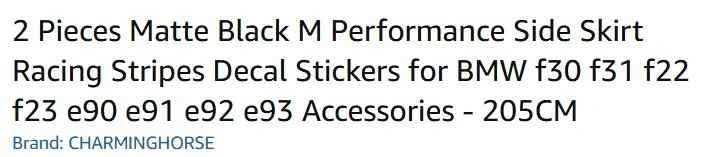 Brand new in box, BMW M Performance side skirt decal. Before and after photo samples here. Bought on Amazon $45 fits most 4 series cars. Looks cool, just never put on before the return period expired and no longer have the car.