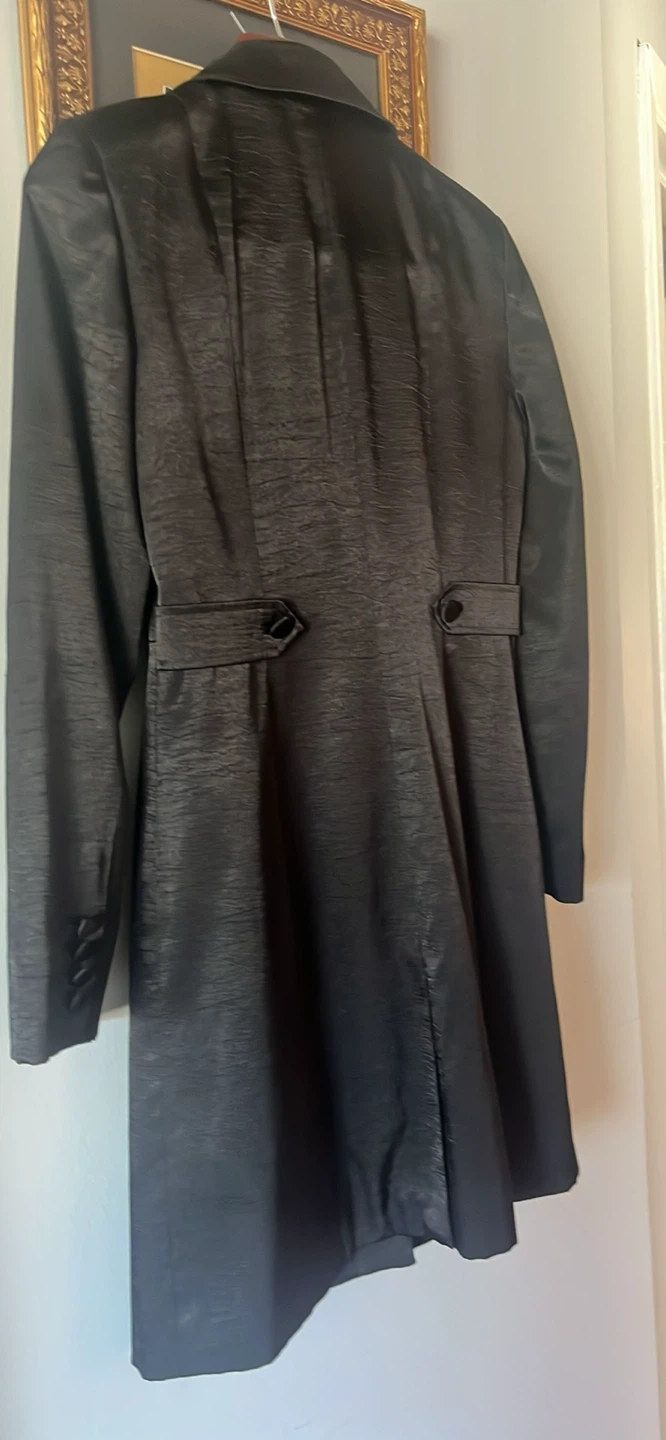This black trench coat from JcPenney features a textured finish and a button-front closure. It has a classic collar and buttoned cuffs. The back includes decorative tab details.