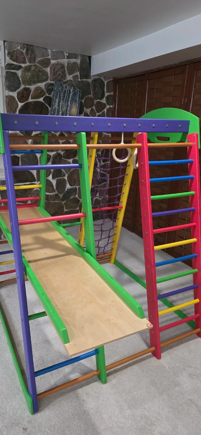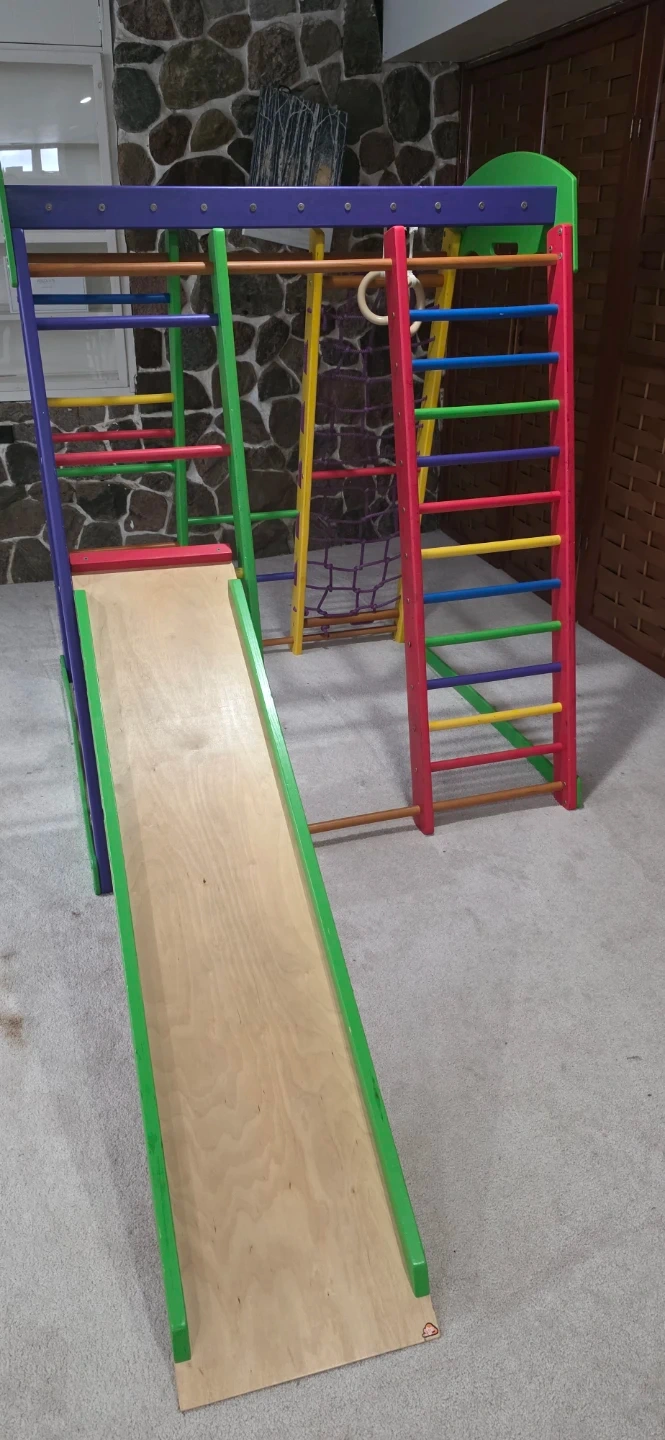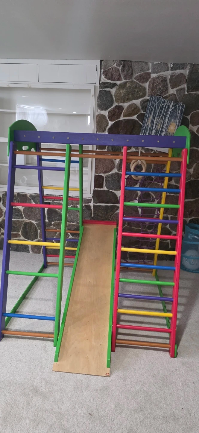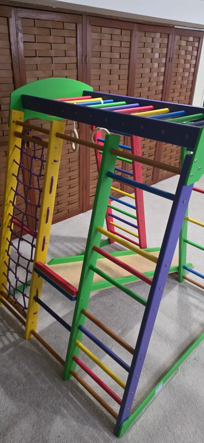 This colourful wooden indoor playground features a slide, climbing, and monkey bars. It's constructed from sturdy wood with brightly coloured rungs and accents. Perfect for active kids to play and explore indoors!