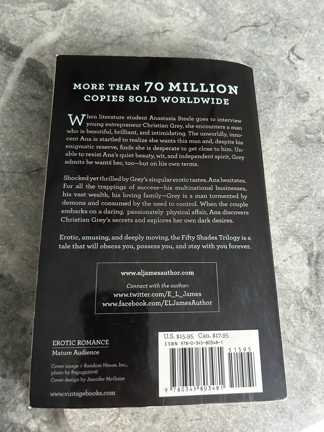 This is the #1 New York Times Bestseller, Fifty Shades of Grey, written by E. L. James. It's a mature romance novel about a young literature student and a wealthy entrepreneur. Over 70 million copies sold worldwide!