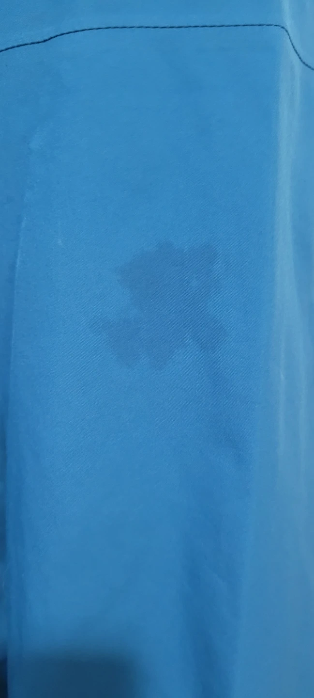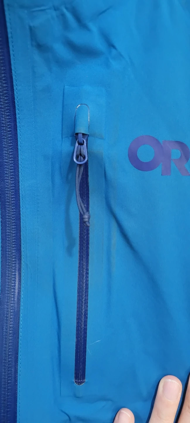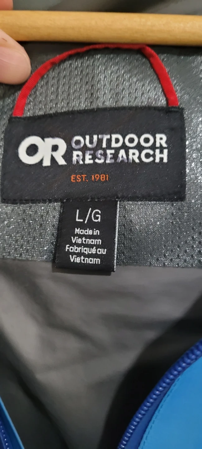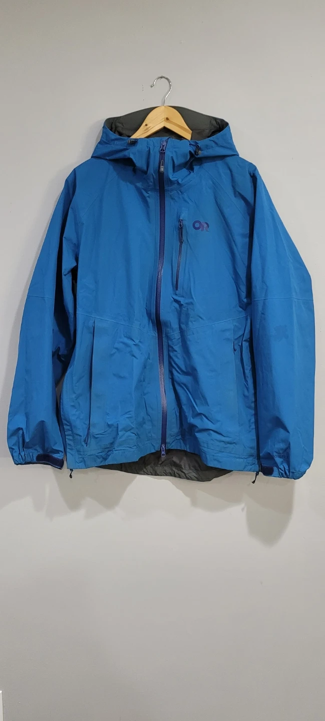 This is a blue Outdoor Research rain jacket. It's a mens size Large. There are some faint stains on the fabric. Good for outdoor activities!