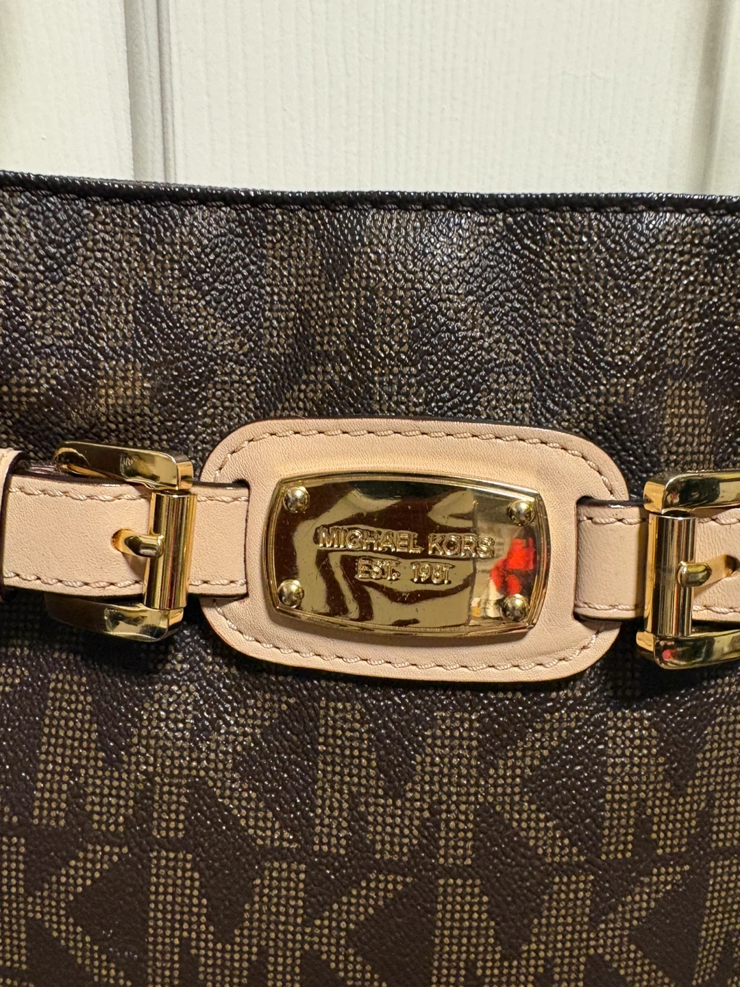 Michael Kors crossbody bag in signature MK print. Beige leather trim and gold-tone hardware. Interior has a fabric lining with the Michael Kors logo pattern. Snap closure on the front flap. The bag is in great condition, just like new! Pick up in Chestermere.