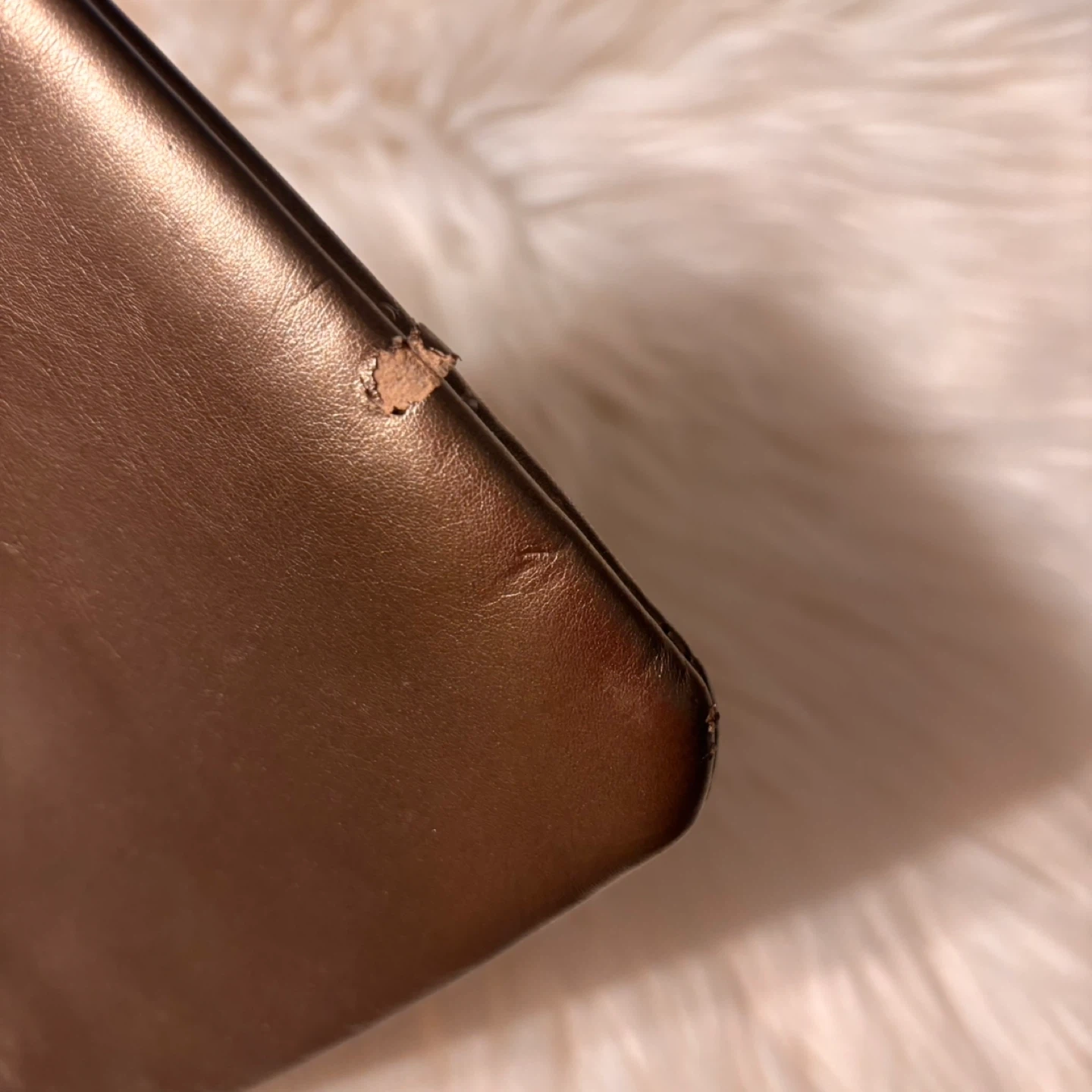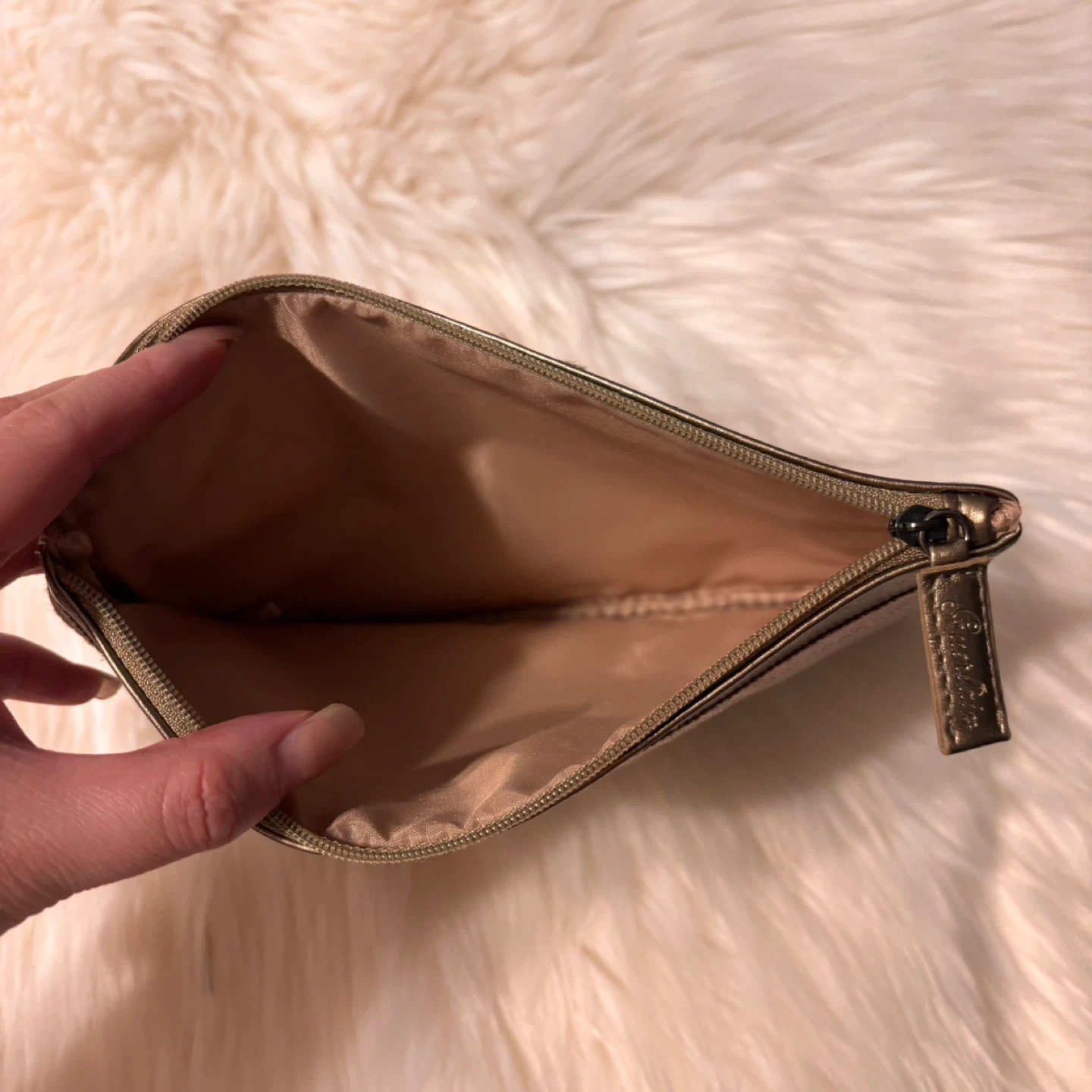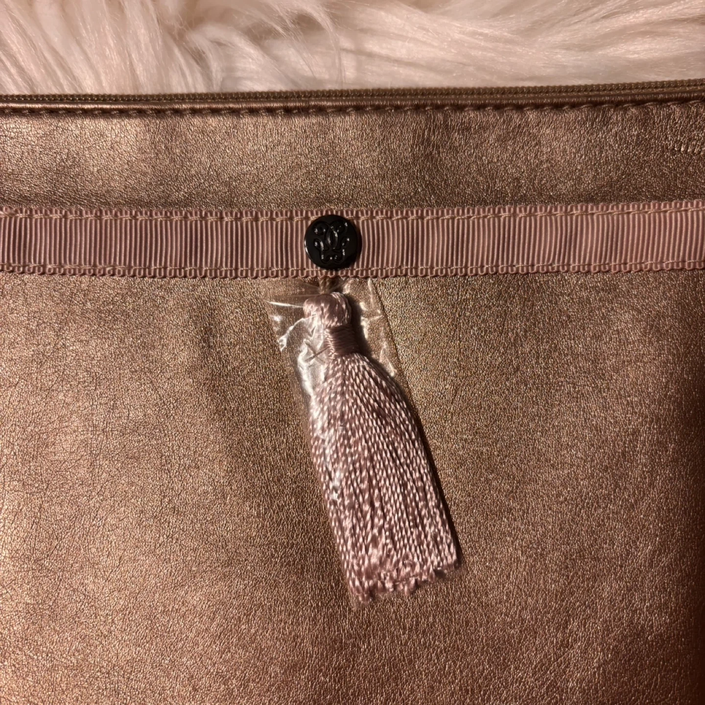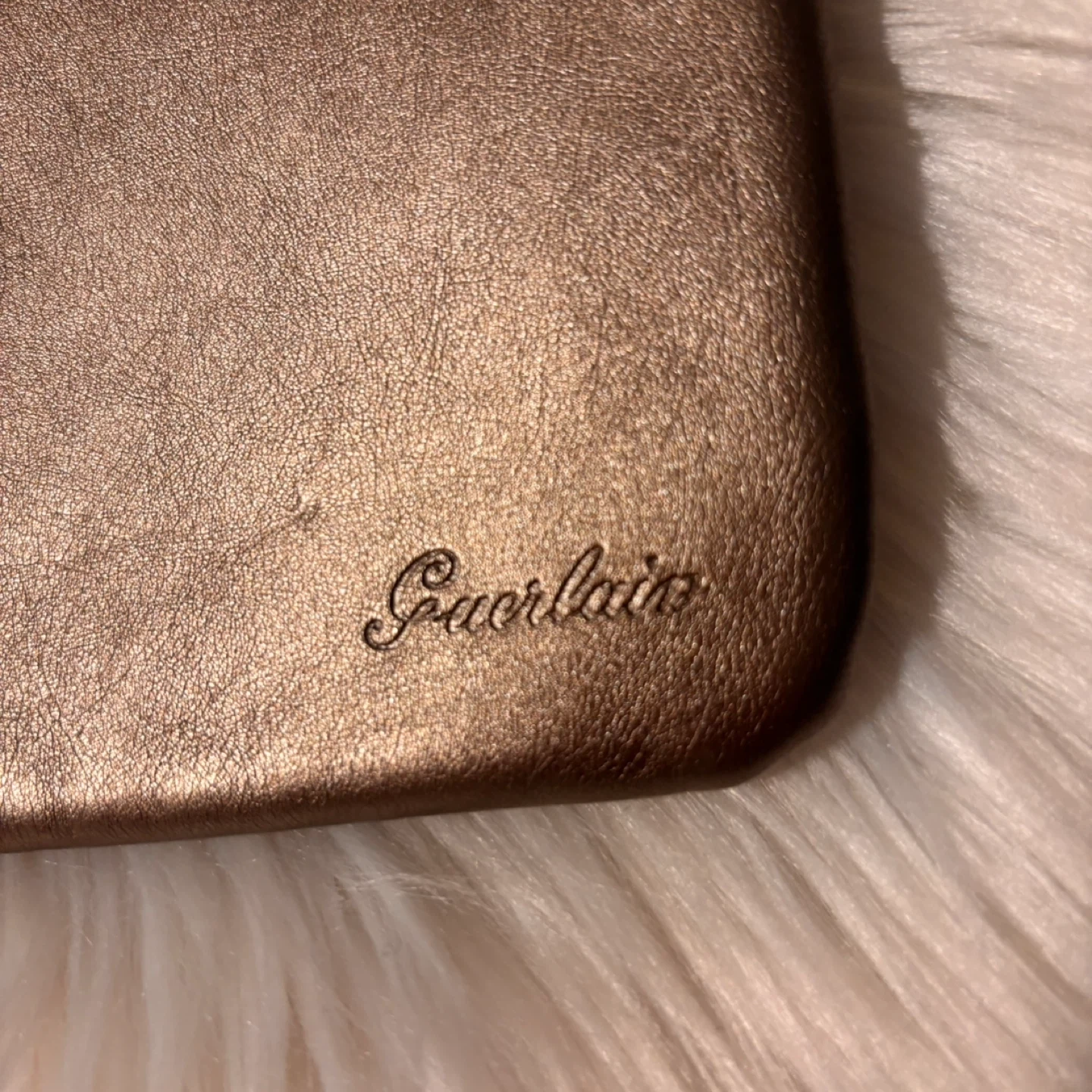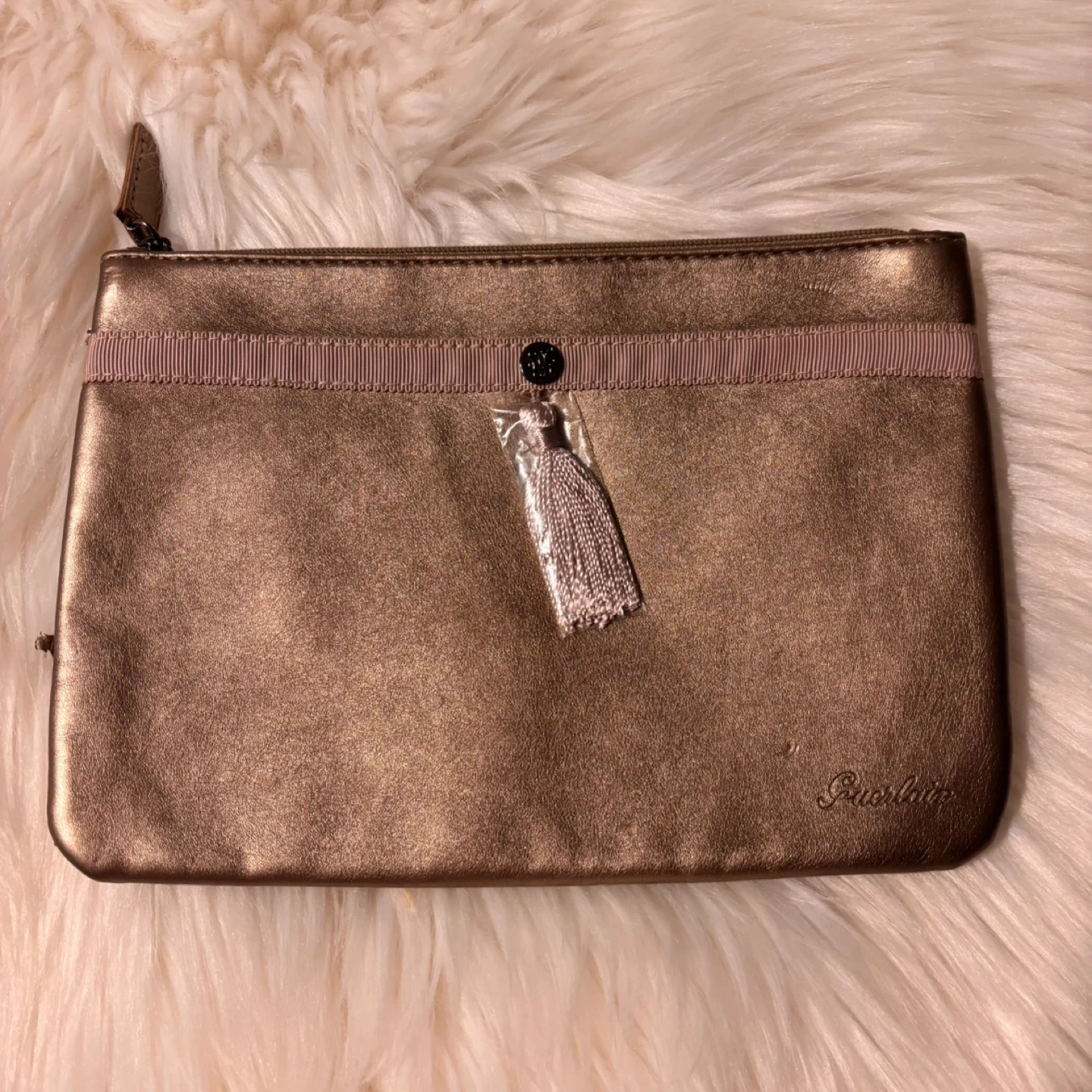 This is a bronze-coloured cosmetic pouch from Guerlain. It's made of a faux leather material and has a zippered closure. It also includes a decorative tassel charm, still in its original packaging.