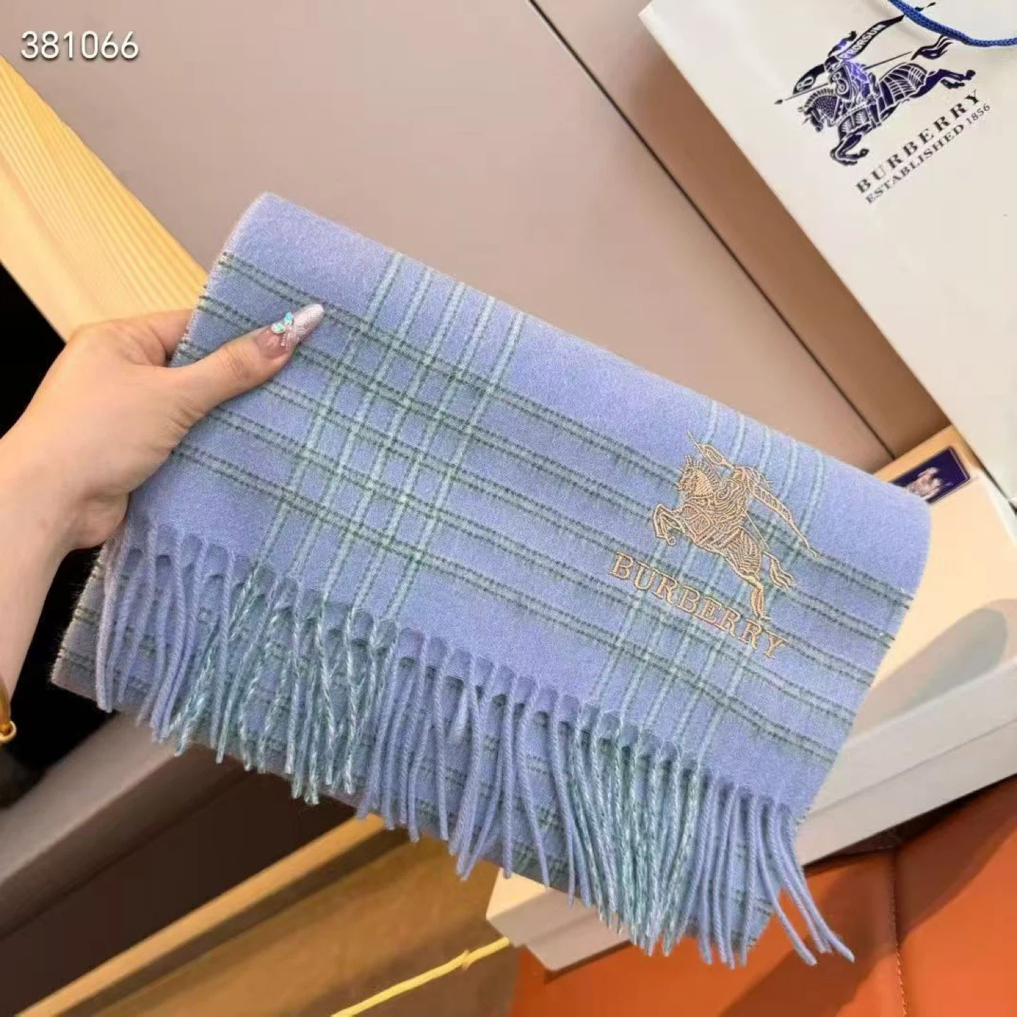 This scarf features a classic plaid pattern with pink and grey accents. It has the iconic equestrian knight logo embroidered on it. The scarf is finished with fringed edges for a stylish look.