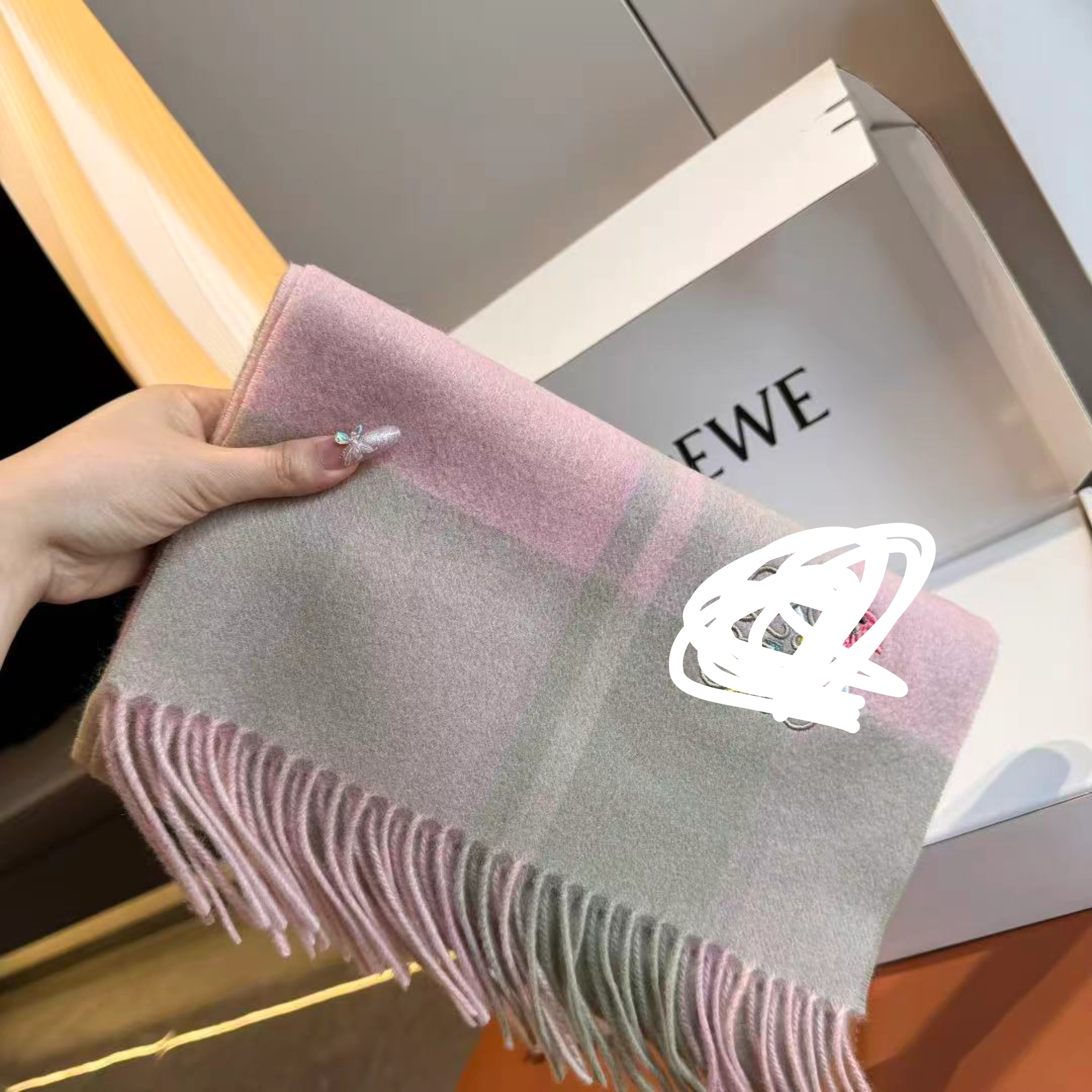 This scarf features a classic plaid pattern with pink and grey accents. It has the iconic equestrian knight logo embroidered on it. The scarf is finished with fringed edges for a stylish look.