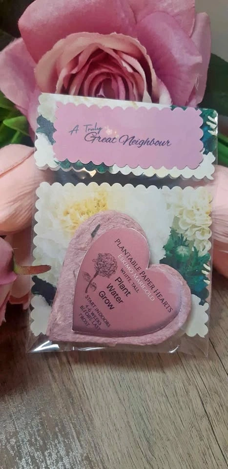 Each package has 3 plantable paper hearts, each heart is made of paper and has Eskimo Marigold seeds embedded within it. These hearts will grow into beautiful flowers when planted to enjoy all summer long. Just place hearts on top of soil in sunlight (each one in a separate pot) and keep moist to grow.