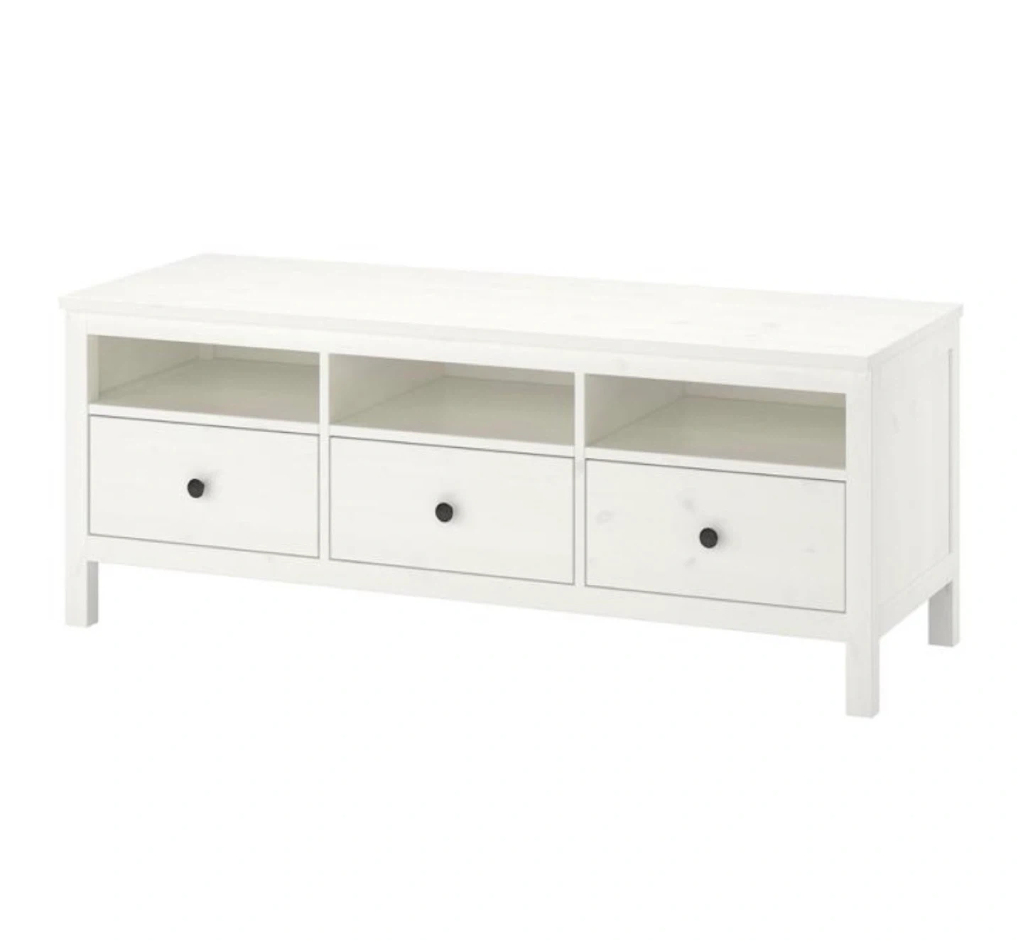Ikea HEMNES TV stand in white. It's got three drawers and three open compartments. Great for organizing your media setup!