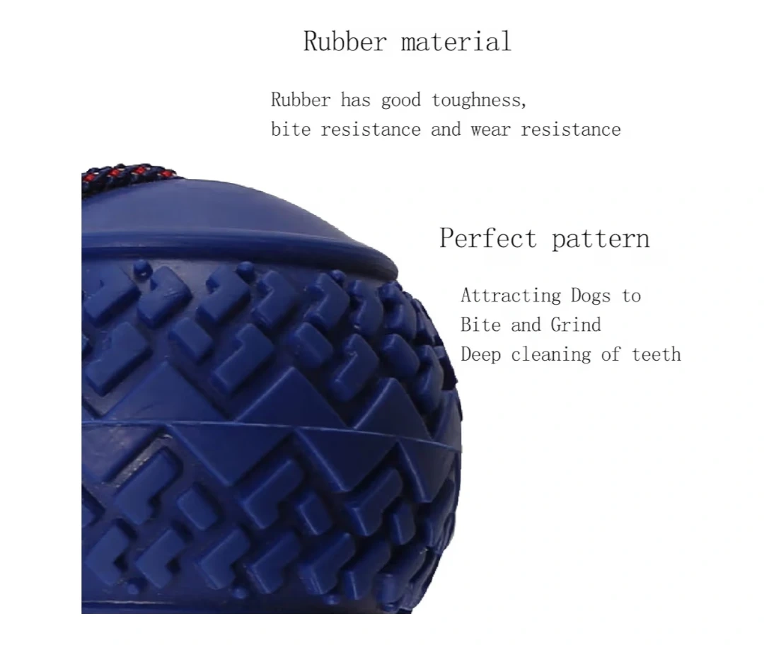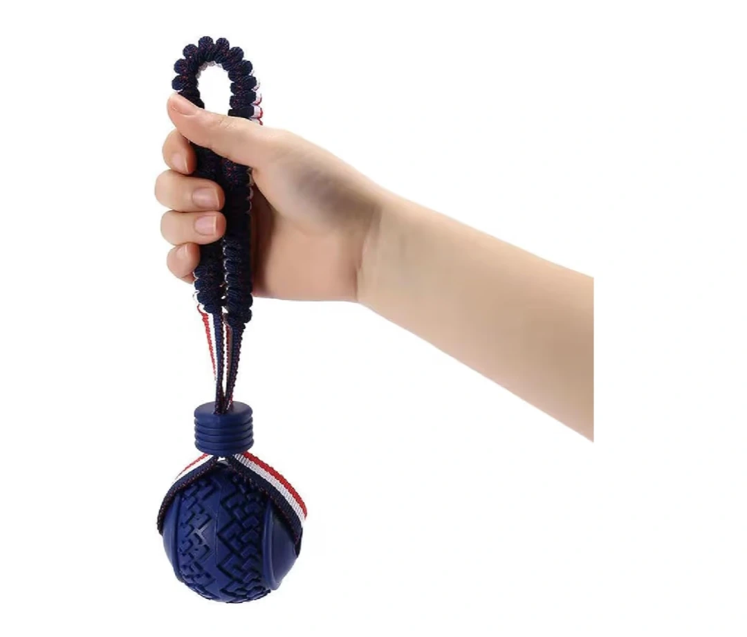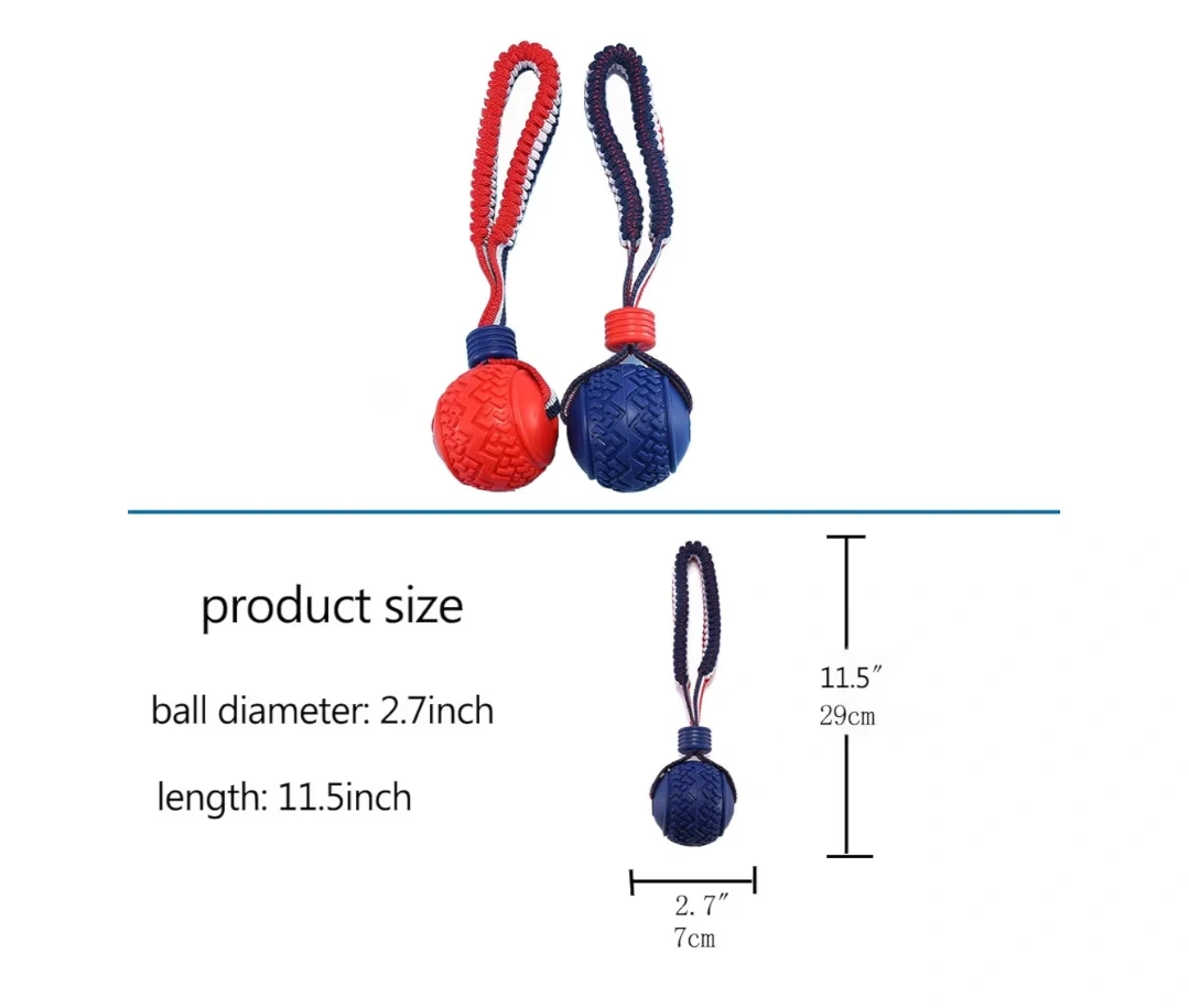 High elastic pull rope for dogs with a rubber ball. Features a sturdy, bite-resistant design for chewing and grinding. Ball diameter is 2.7 inches and length is 11.5 inches.