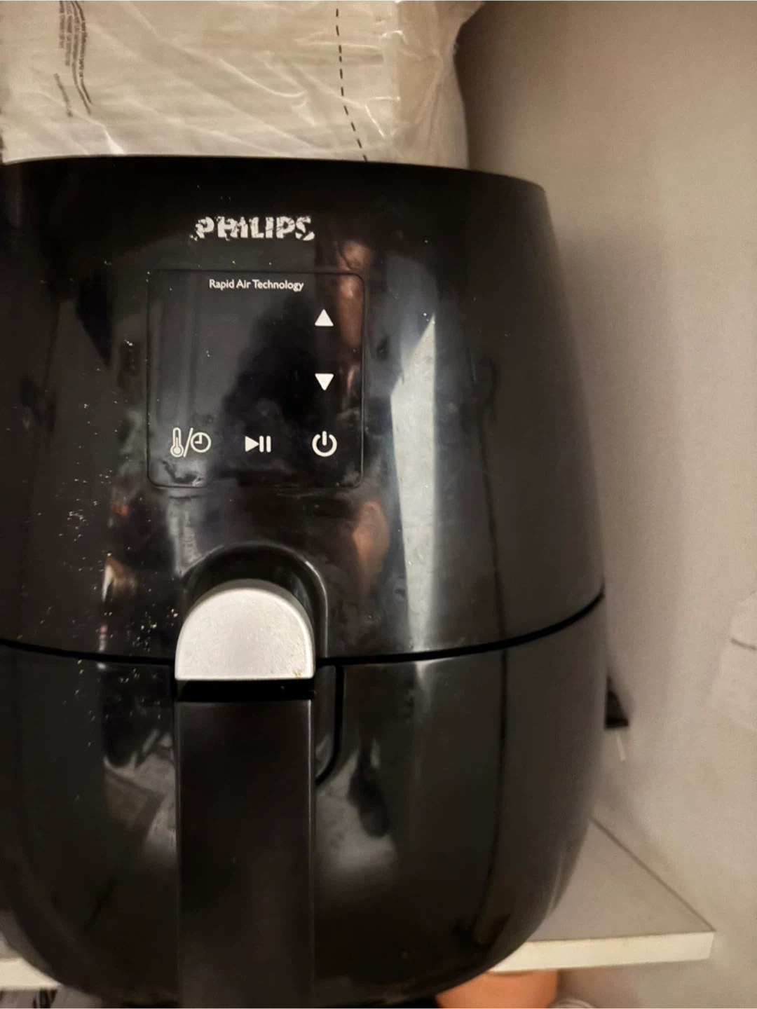 Philips air fryer with Rapid Air Technology. This appliance fries, bakes, roasts, and grills. It's black and has a digital display with temperature and timer controls. Quick sale, quick pick up.