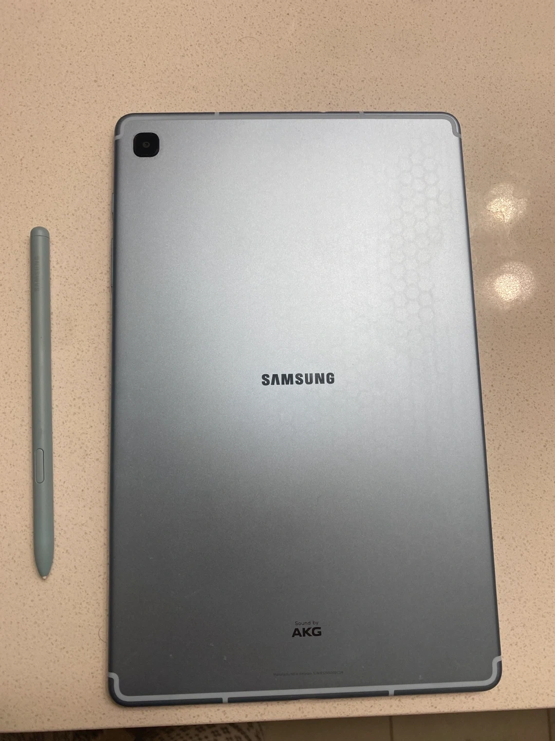 Samsung Galaxy Tab S6 Lite tablet in blue with an S Pen. It features a 10.4-inch display and AKG-tuned speakers. It's great for notes and drawings! Comes with original box! Barley used, works perfectly!