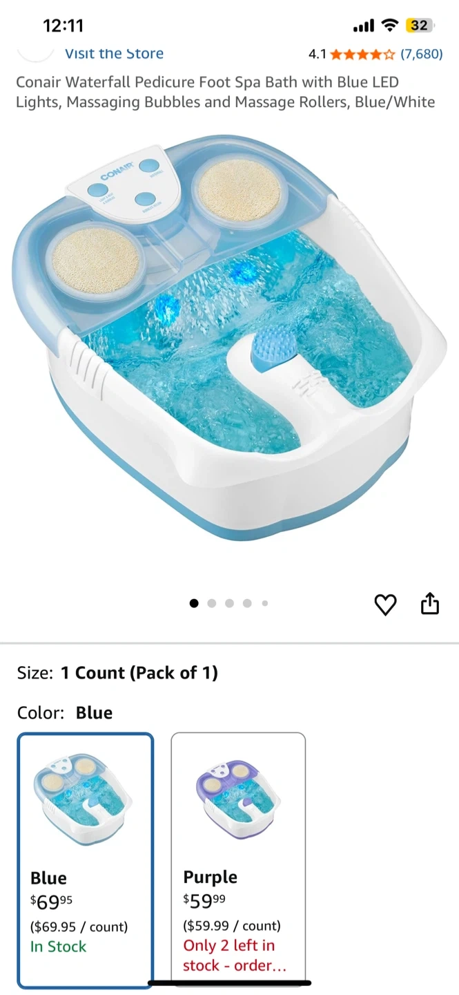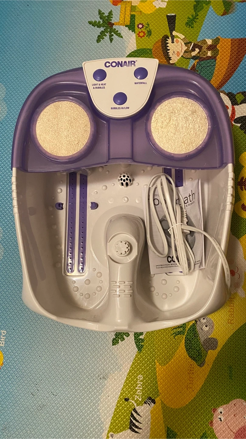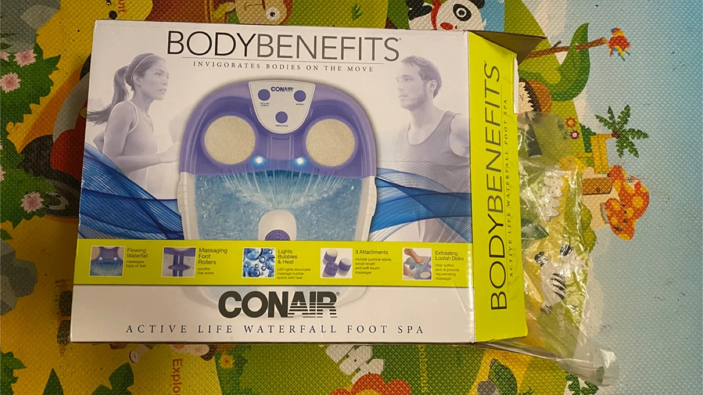I'm selling a Conair BodyBenefits Active Life Waterfall Foot Spa. It invigorates bodies on the move! It has a flowing waterfall, massaging foot rollers, lights, bubbles, and 3 attachments that include a pumice stone and soft brush massager. The box is included