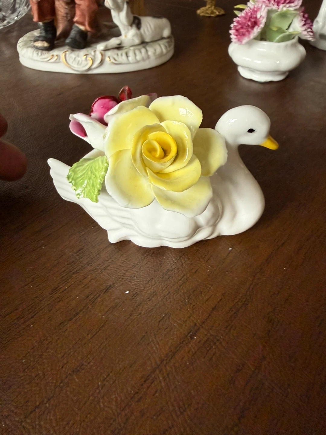 A charming white bone china swan figurine, handcrafted in England. It's adorned with delicate porcelain roses in shades of yellow and red. This piece would make a lovely decorative accent.