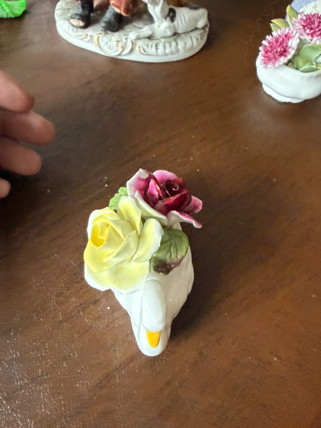 A charming white bone china swan figurine, handcrafted in England. It's adorned with delicate porcelain roses in shades of yellow and red. This piece would make a lovely decorative accent.