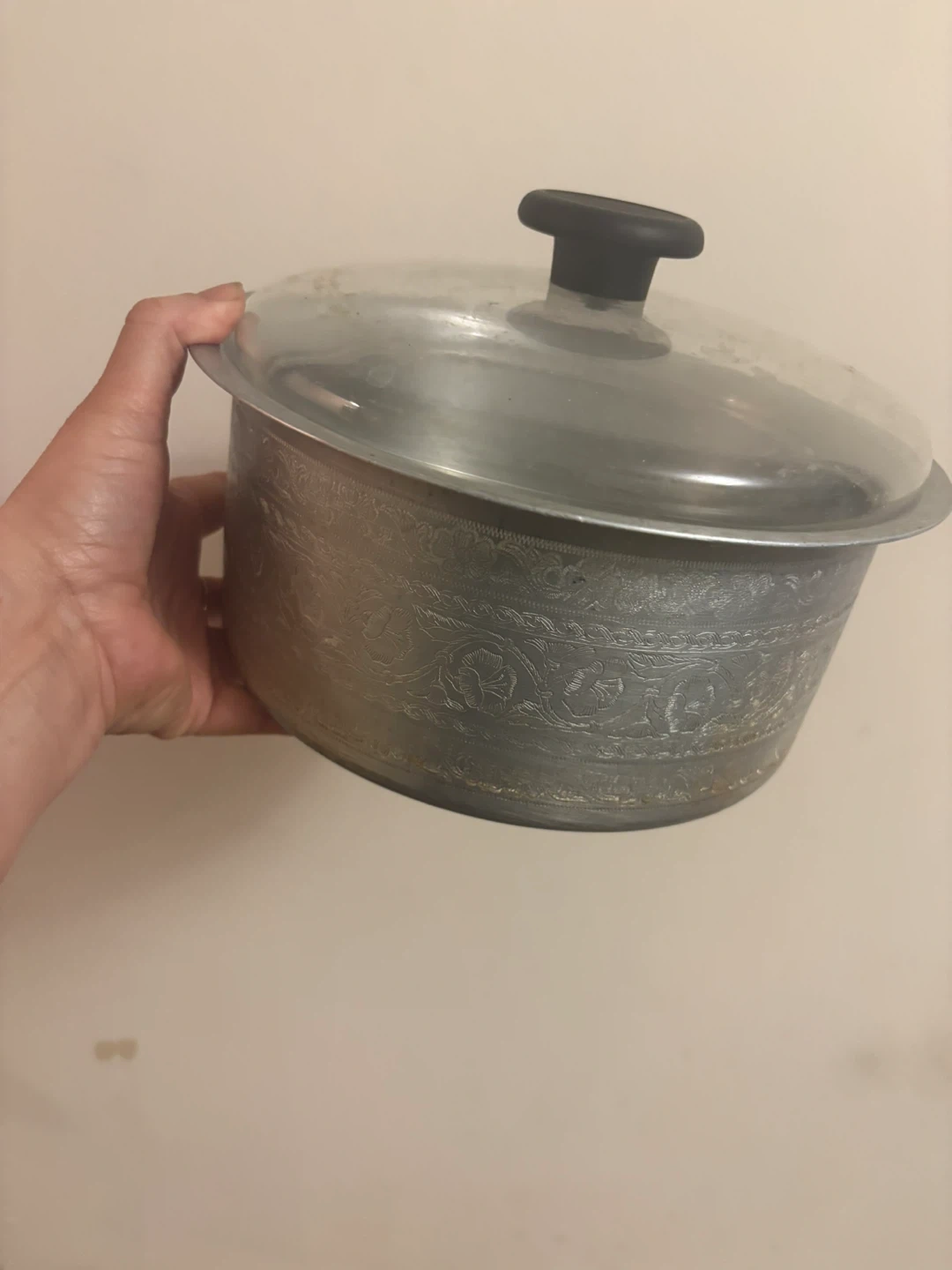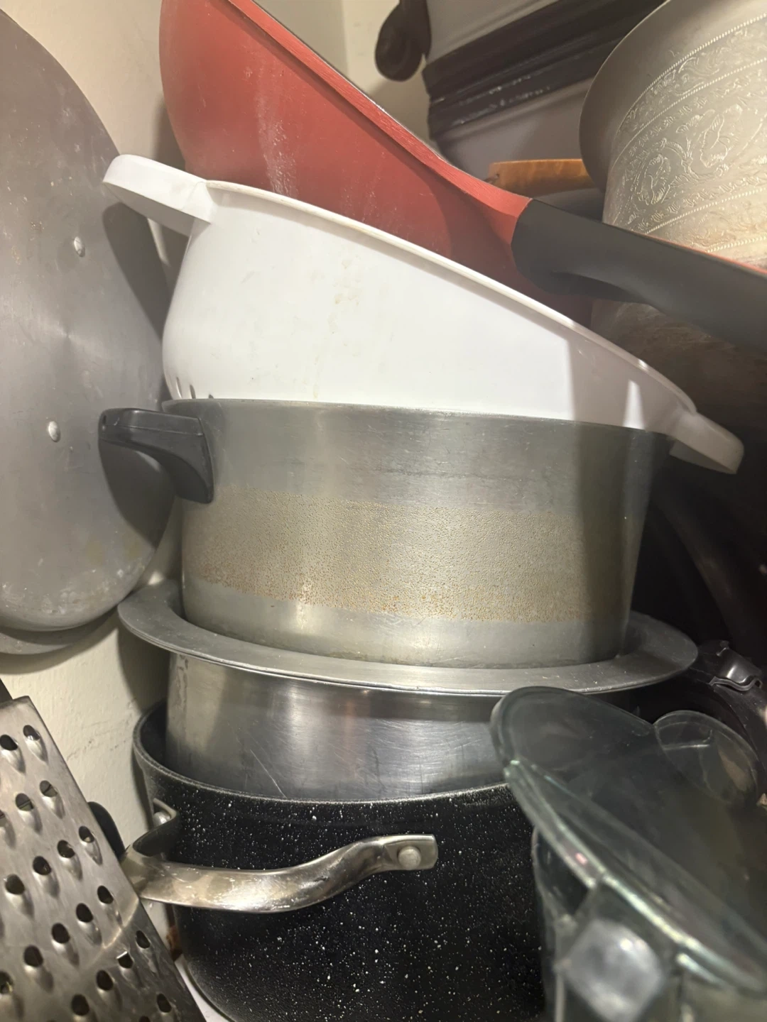 Includes a variety of cooking pots and a small black rice cooker. Some pots have decorative etching and glass lids. The rice cooker has a clear lid with a black handle and a power cord. Moving seal.