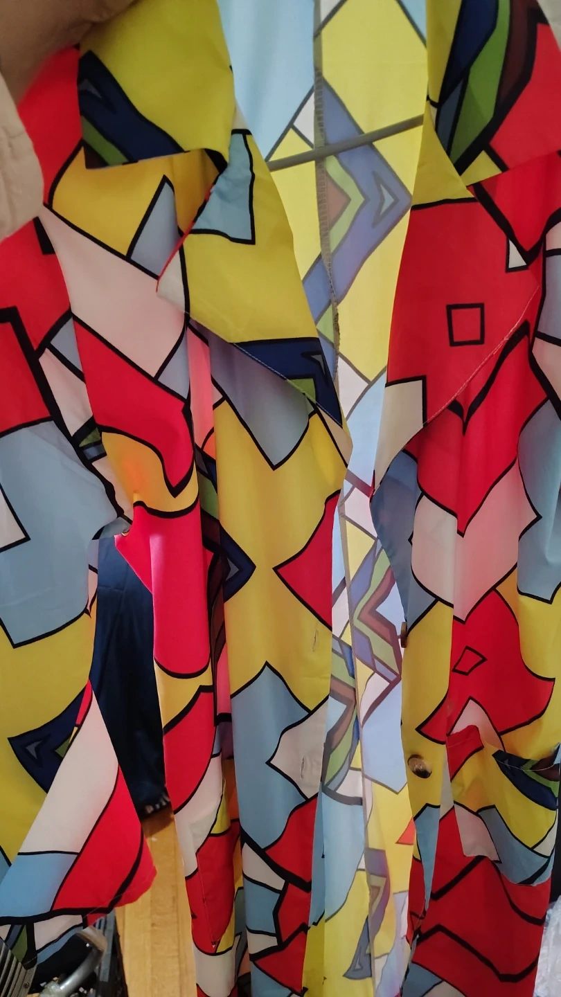 This is a vibrant button-up shirt with a bold geometric pattern. It features a colorful design with red, yellow, blue, and black accents. The material appears to be lightweight.