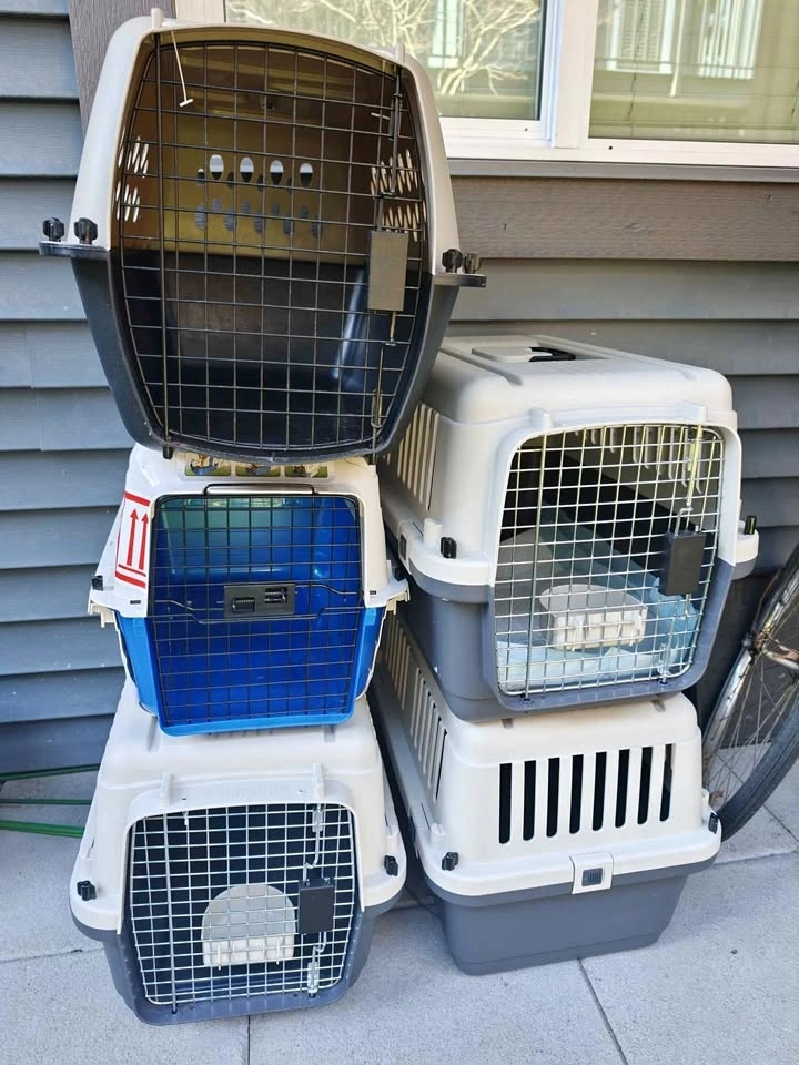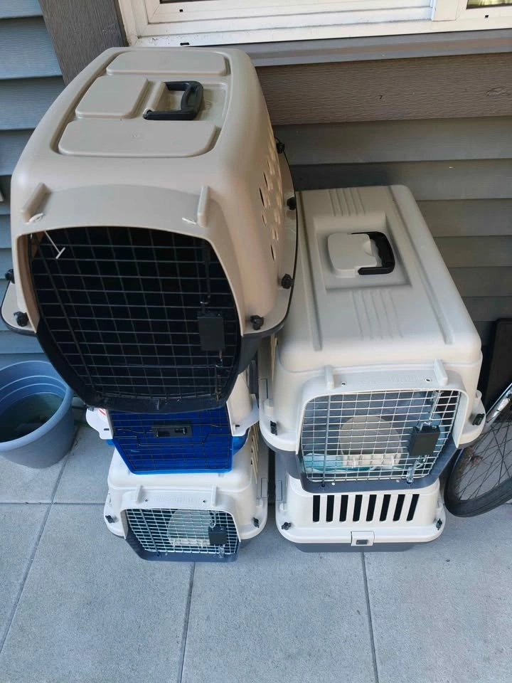 Sturdy dog and cat kennels available for $30 each. These are flight approved and measure 24x16x15 inches, suitable for pets up to 20 lbs. They are made of all plastic with metal gates and are great for car trips, home use, or flights.