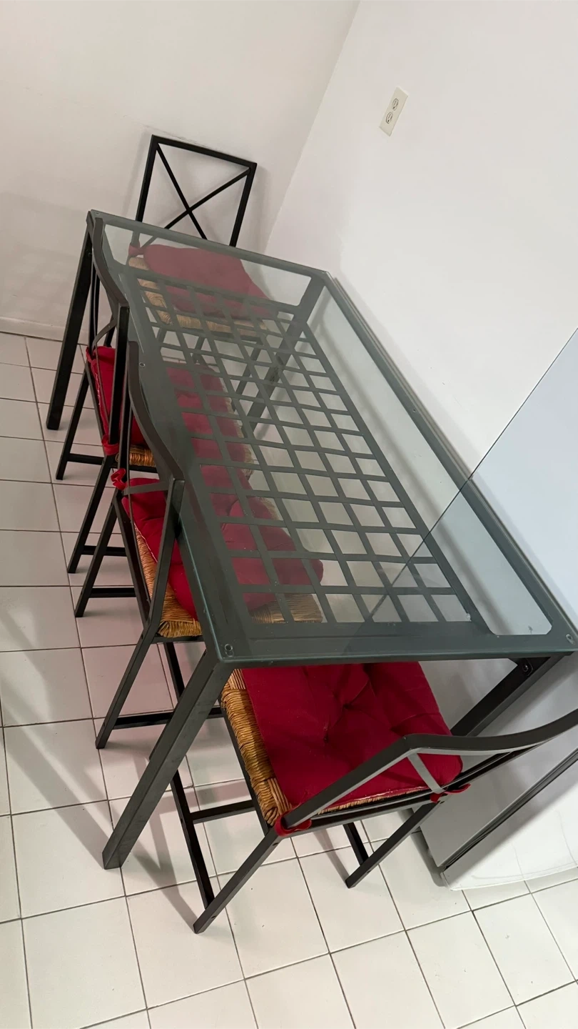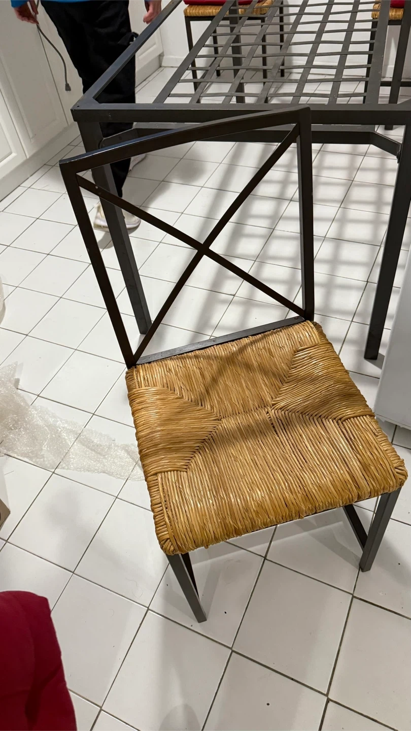 Selling a set of dining chairs with black metal frames and woven seats. One chair has a red cushion, while the others have the natural woven seat showing. They'd be a great addition to any dining room!