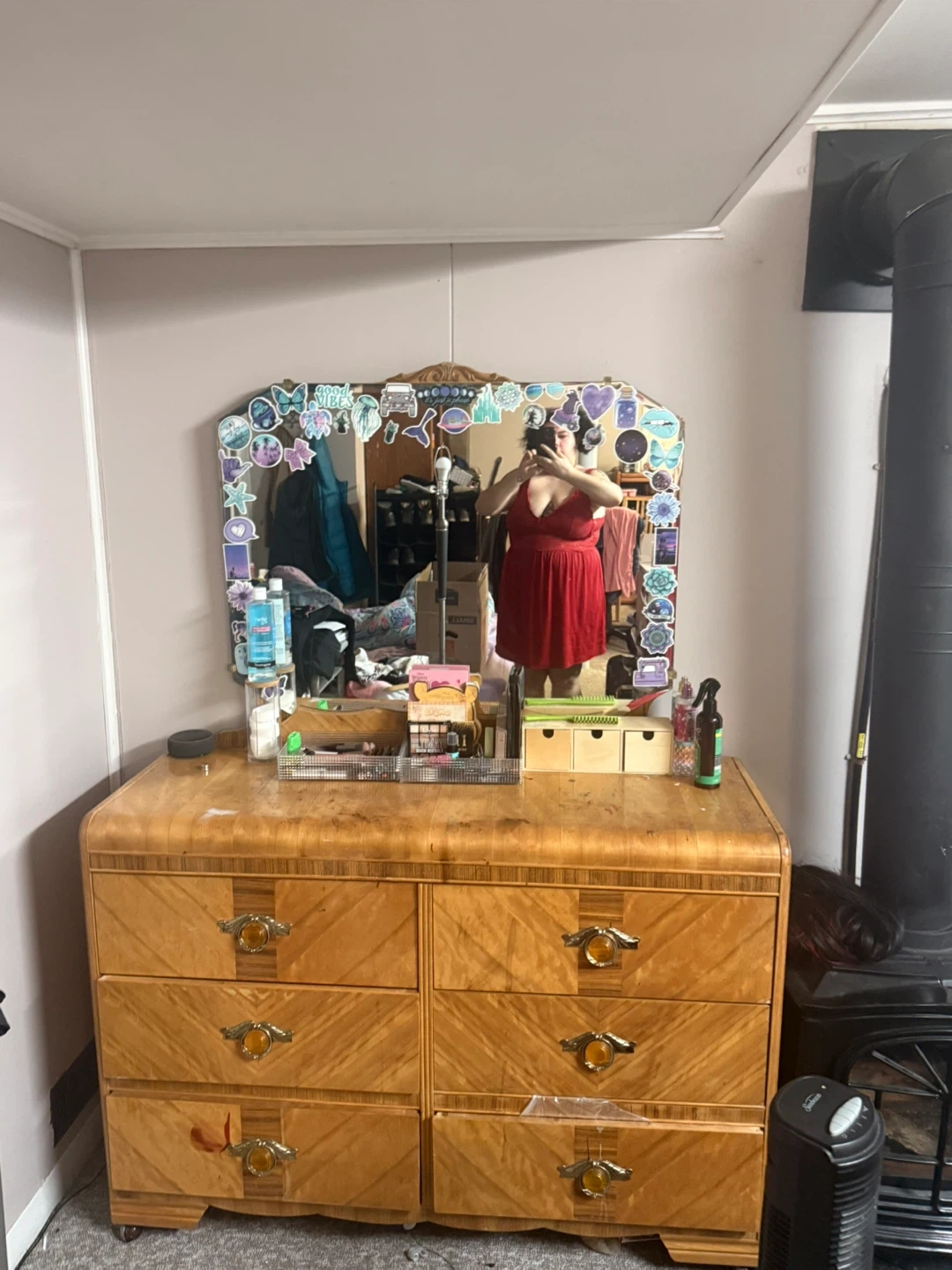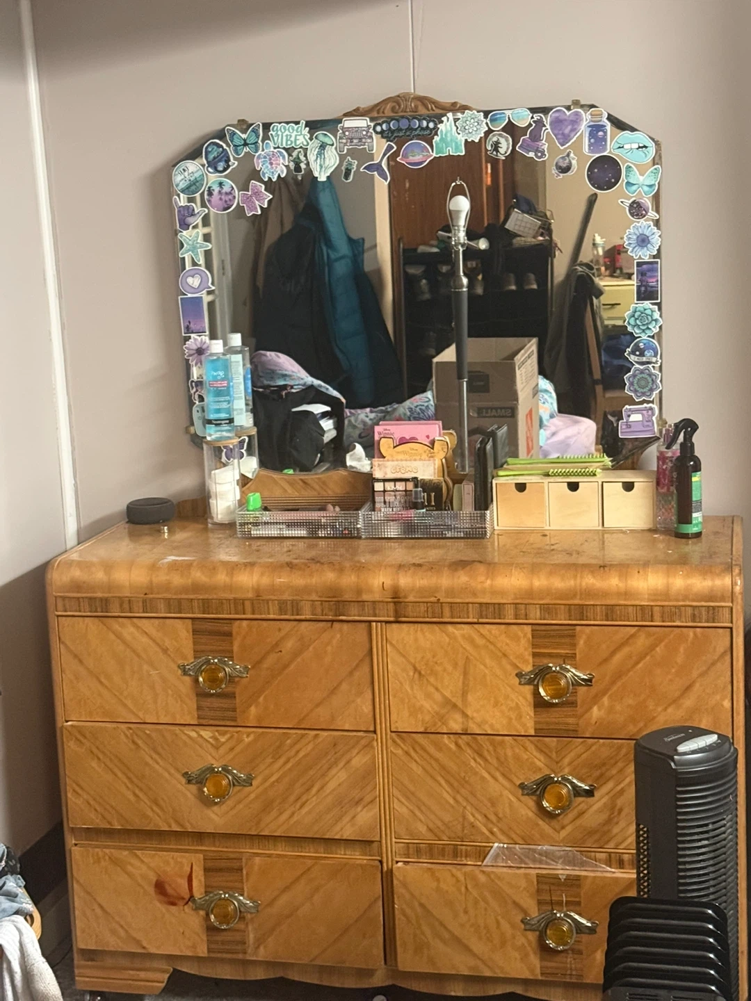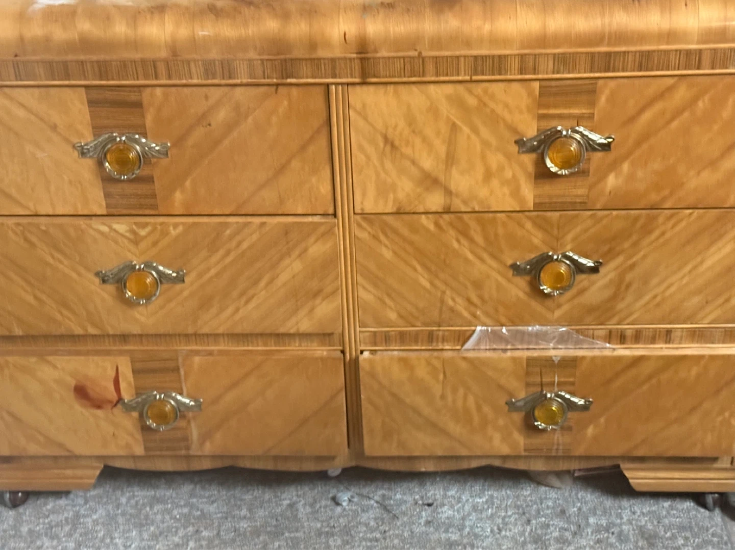 This is a vintage dresser with a mirror. It features six drawers and a decorative wooden top. The dresser has a warm, light wood finish with unique grain patterns and amber-toned drawer pulls. It's a great piece for organizing clothes or accessories.