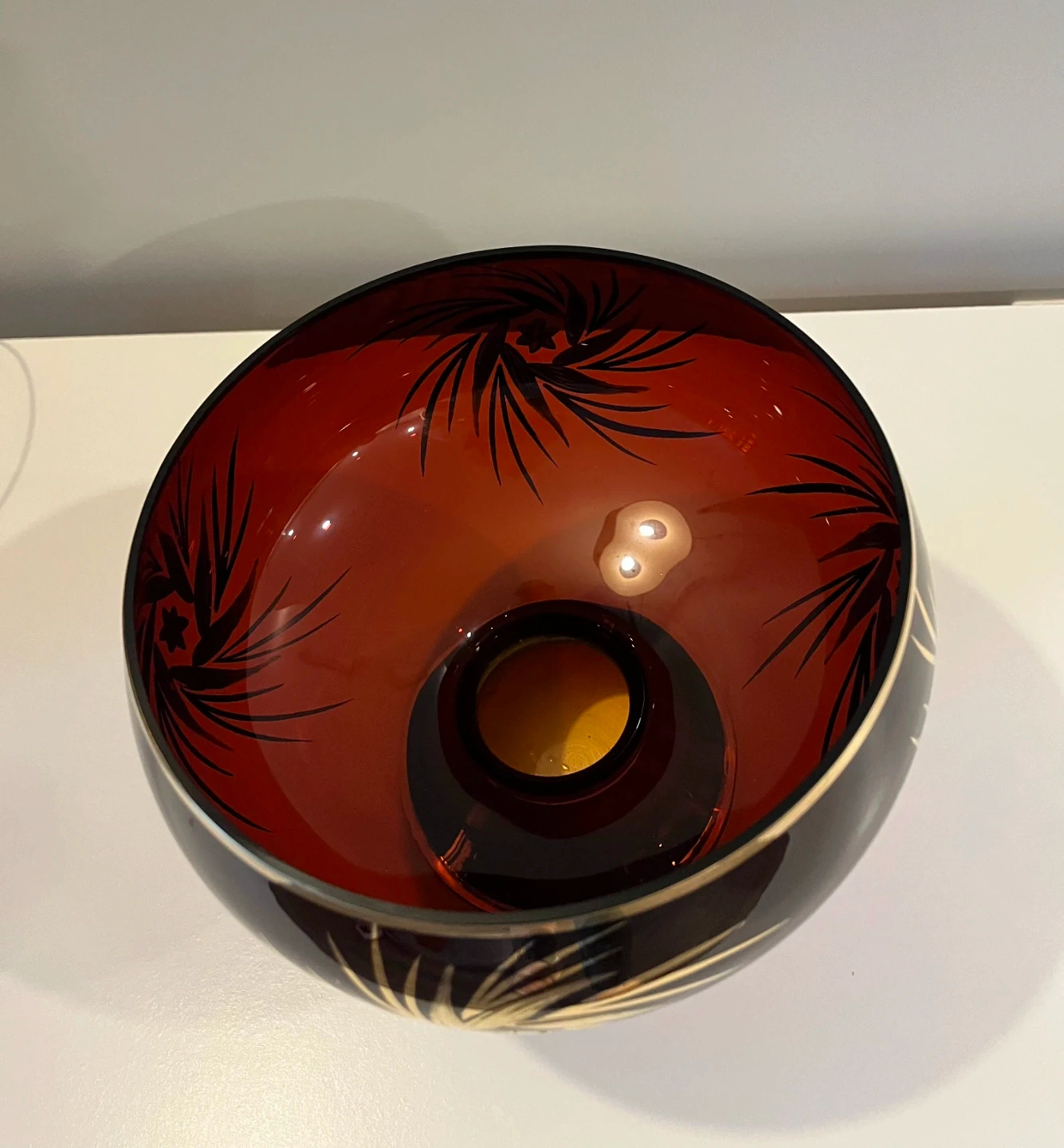 Beautiful dark red glass bowl with gold accents. It features an ornate etched design and a gold rim. Approximately 18 cm tall.