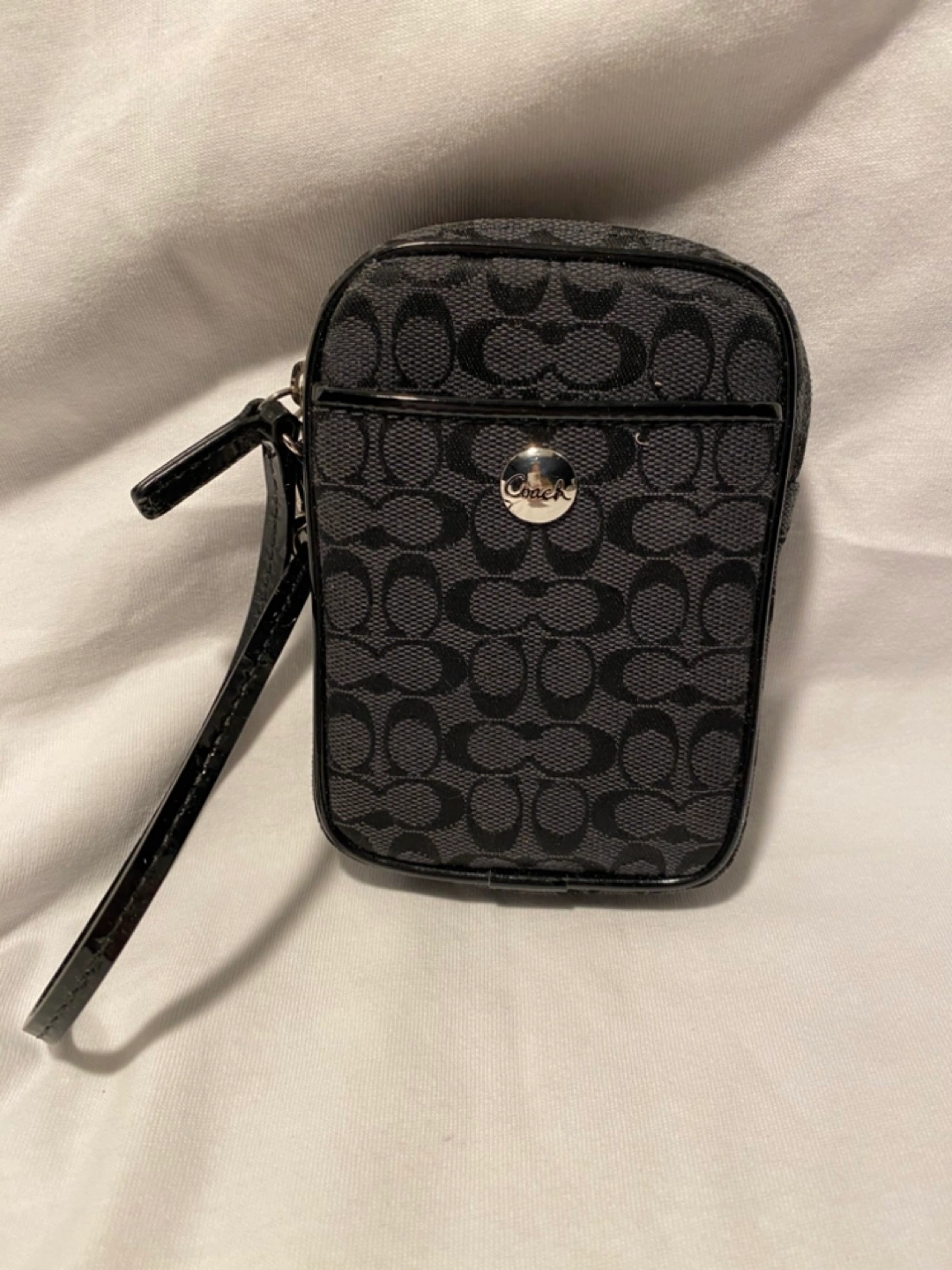 Small black Coach wristlet. Signature C pattern. Black patent leather accents. Wrist strap included. Zipper closure.