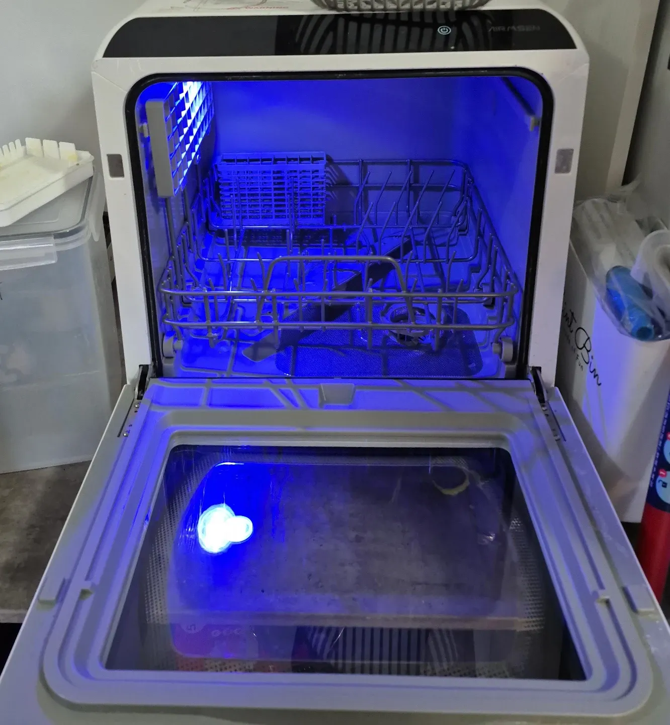 Compact countertop AIRMSEN dishwasher, perfect for small kitchens or RVs. It's a countertop model designed for convenience. Includes a basket for dishes and cutlery and a fruit washing basket. Instructions included. Cash only, no trades