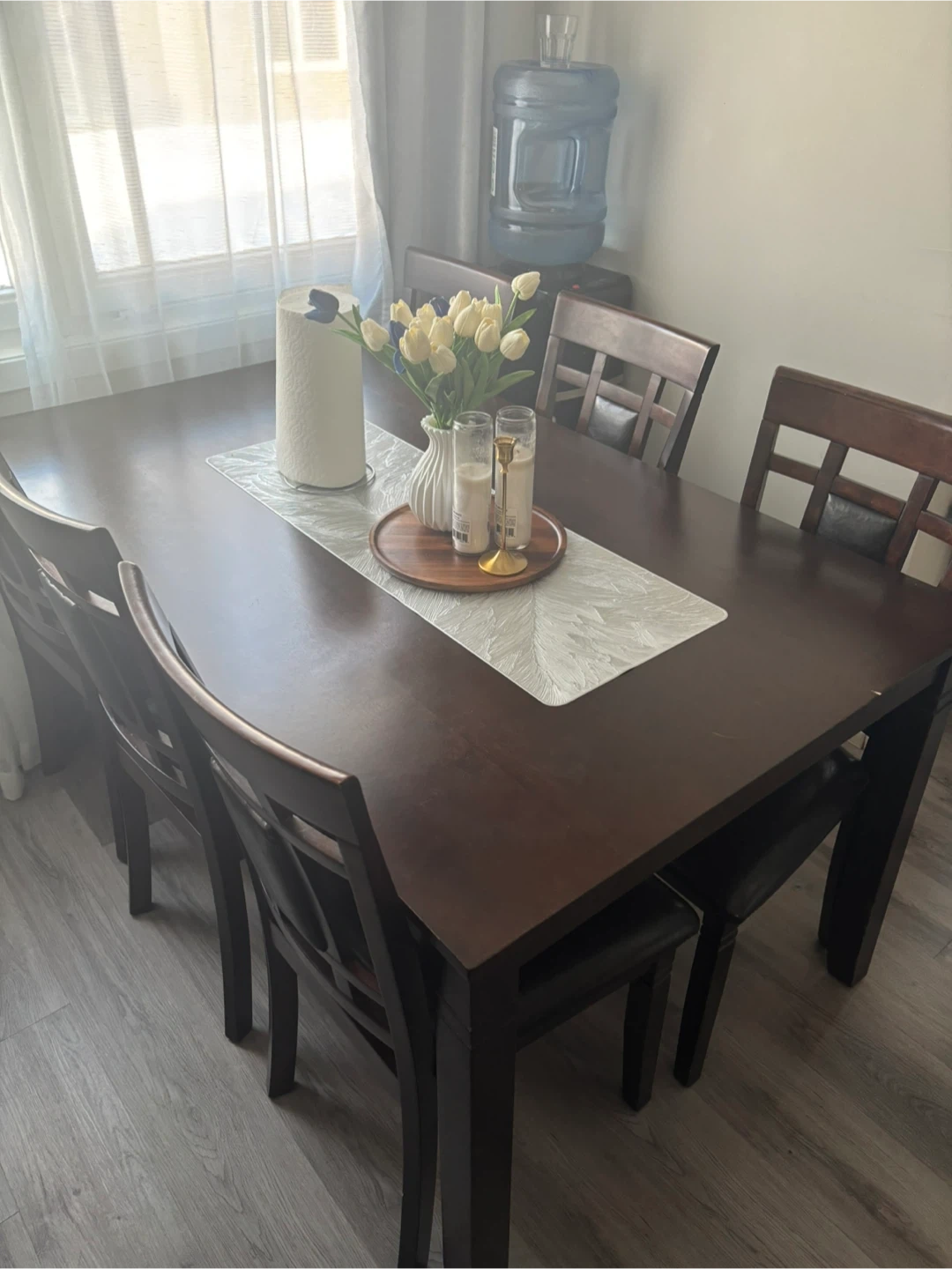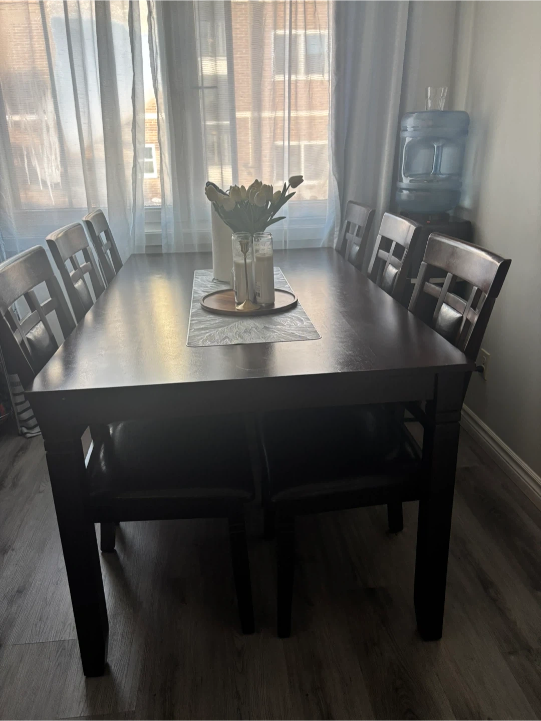 This is a sturdy dark wood dining table with six matching chairs. The chairs are upholstered in a dark material. It's a great set for family dinners or entertaining guests.
