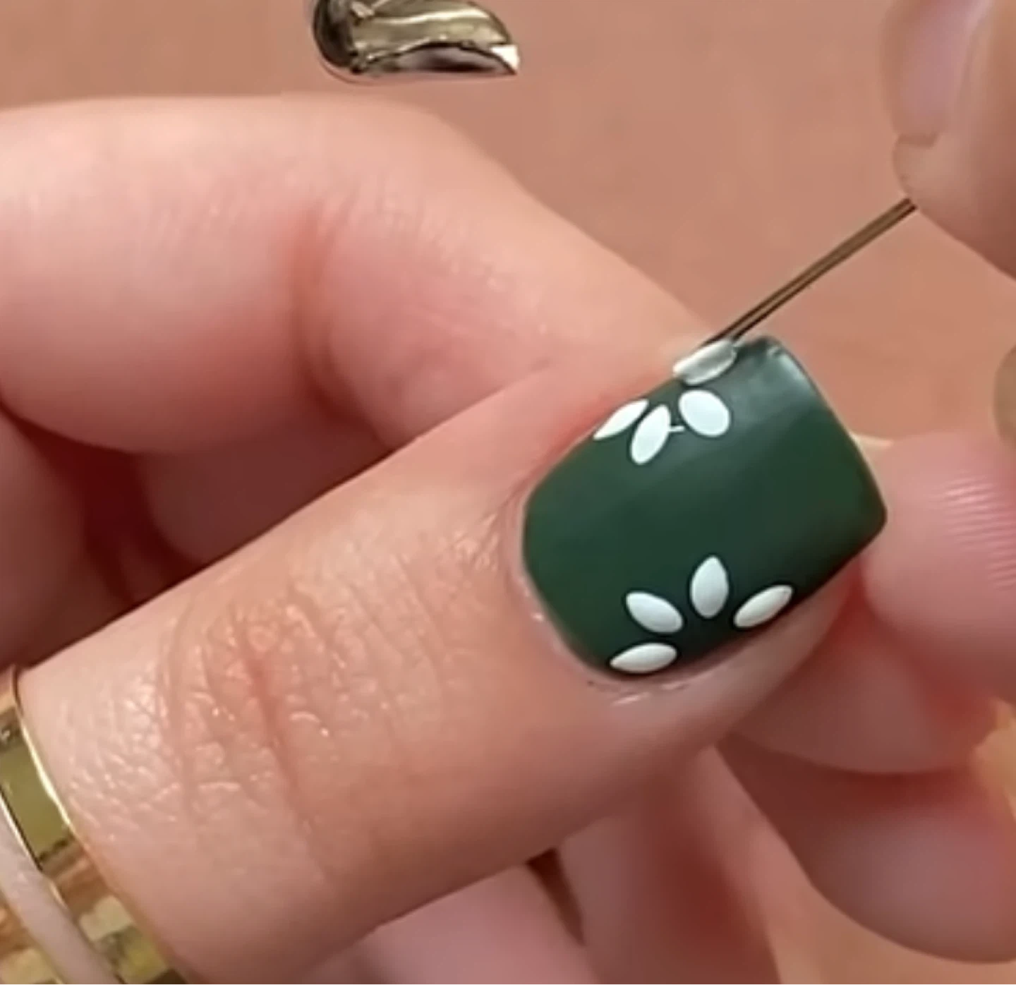 This set includes a metal nail art dotting tool and a small amount of white nail polish. It's perfect for creating detailed designs on your nails, like the floral pattern shown. The fine tip allows for precise application of polish.