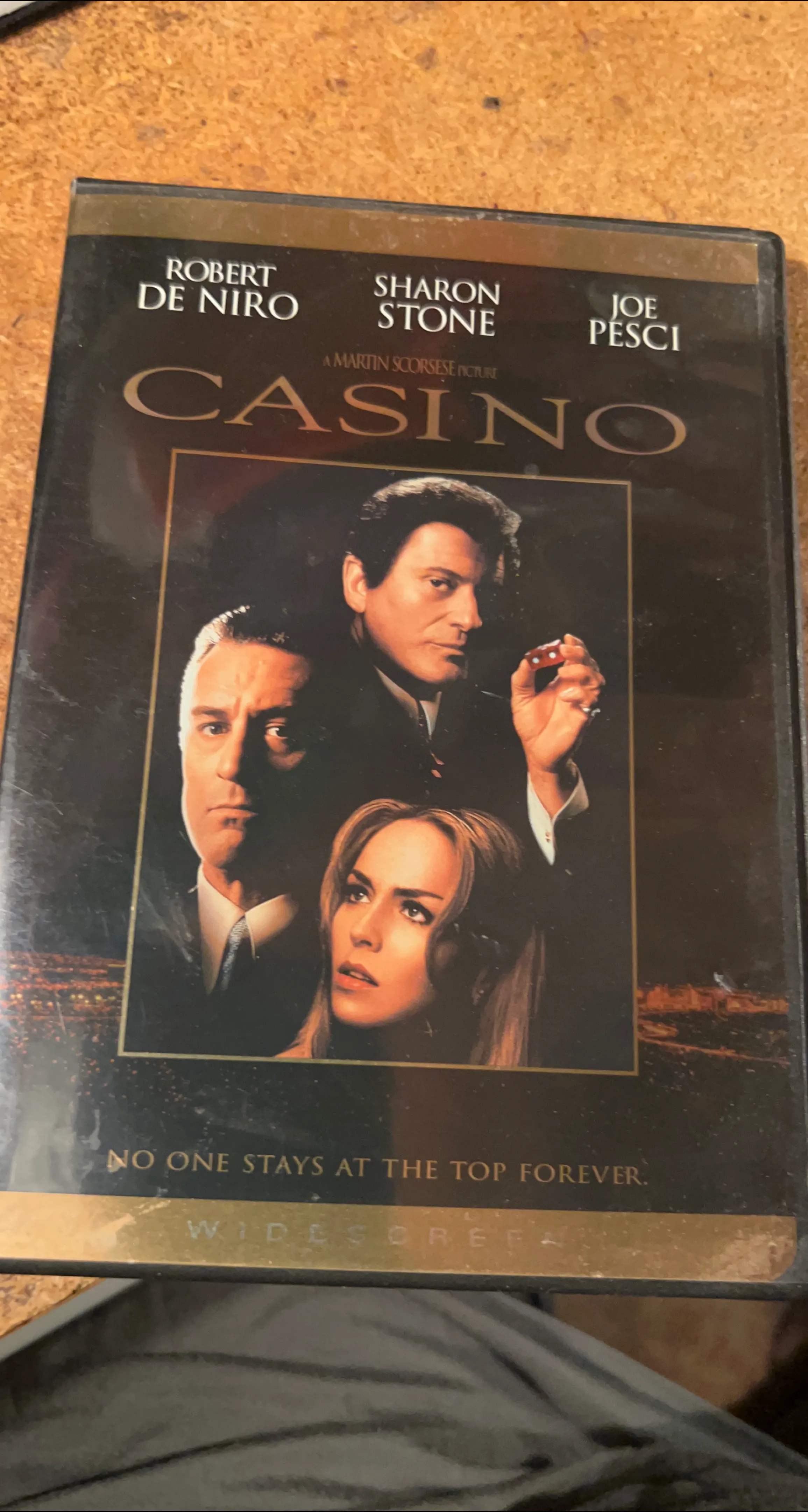 Selling a used DVD of the movie Casino, starring Robert De Niro, Sharon Stone, and Joe Pesci. A Martin Scorsese picture, it's a widescreen edition. "No one stays at the top forever