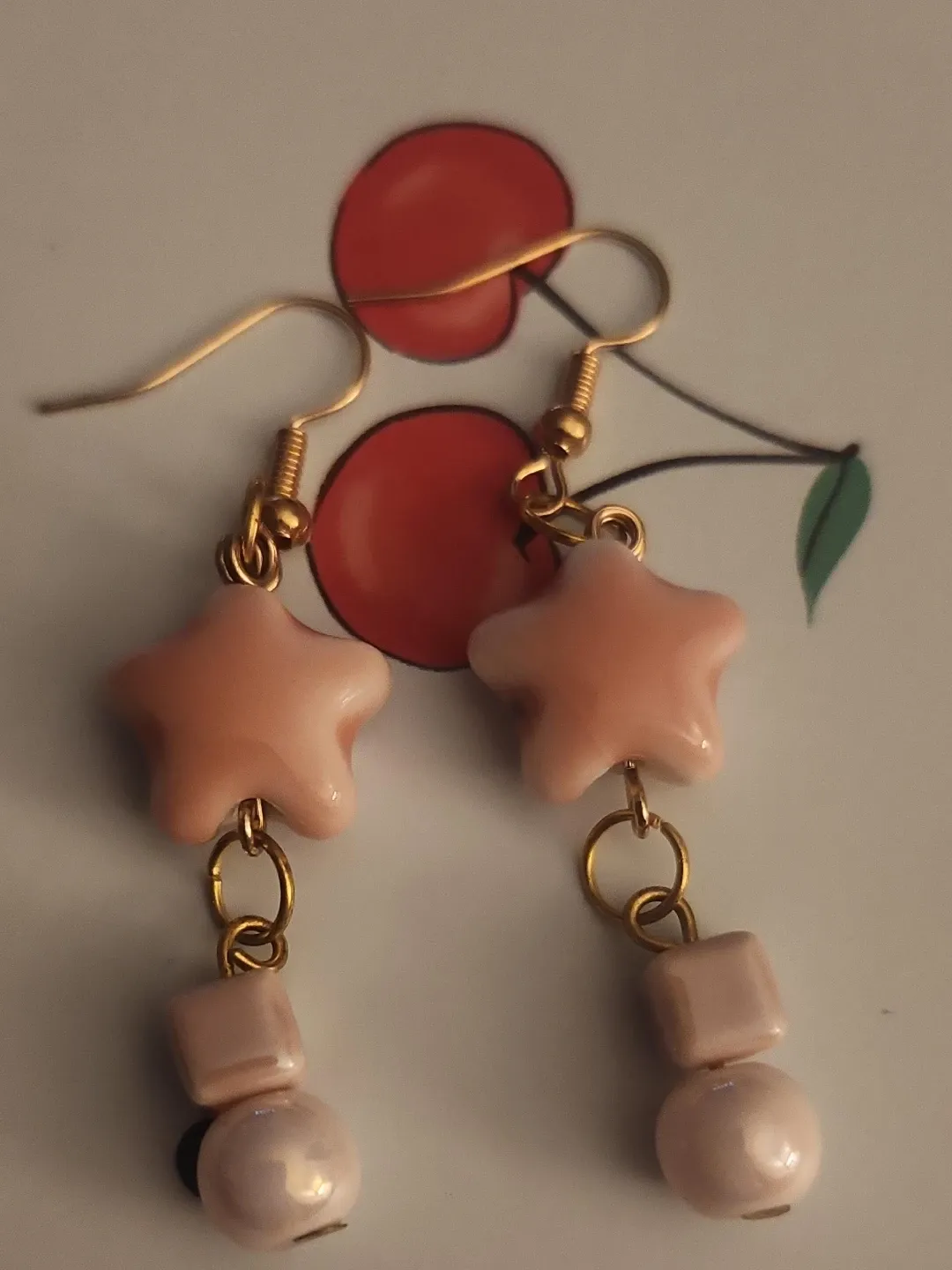 Cute dangle earrings with pink star charms. Features small pink cube and pearl-like beads. Great for adding a touch of fun to your outfit!