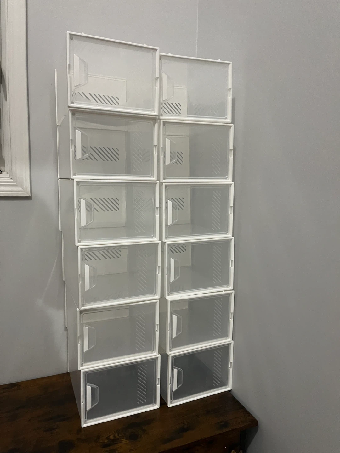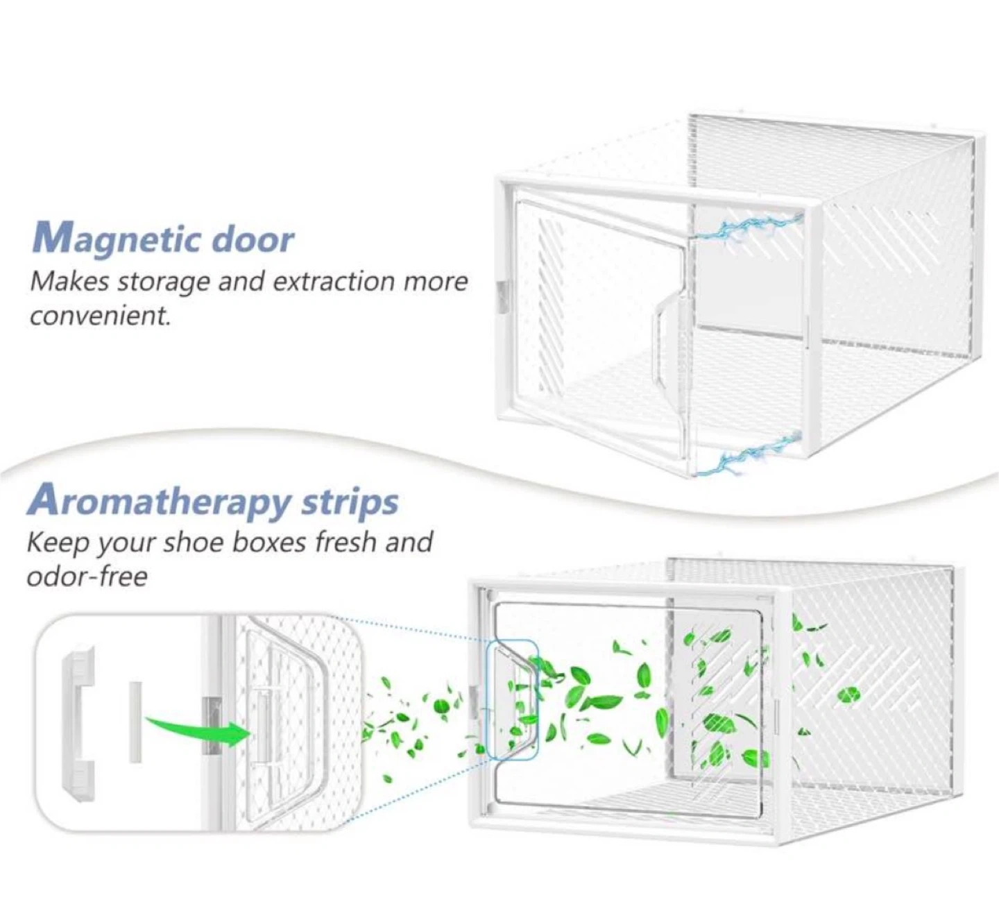White plastic shoe boxes with clear magnetic doors. Boxes feature ventilation and aromatherapy strips to keep shoes fresh. Dimensions: 25cm/9.8in (W) x 33.2cm/13.1in (D) x 18.7cm/7.5in (H). Fits women's up to US 13 and men's up to US 12.