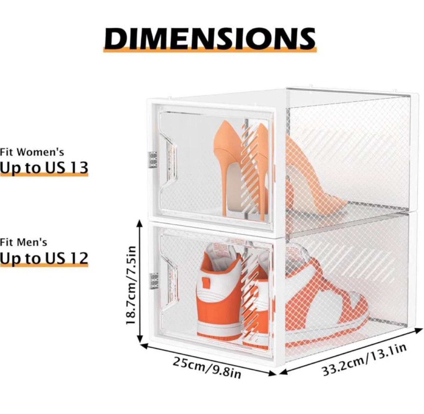 White plastic shoe boxes with clear magnetic doors. Boxes feature ventilation and aromatherapy strips to keep shoes fresh. Dimensions: 25cm/9.8in (W) x 33.2cm/13.1in (D) x 18.7cm/7.5in (H). Fits women's up to US 13 and men's up to US 12.